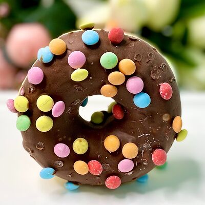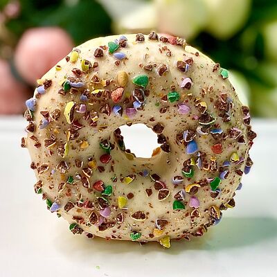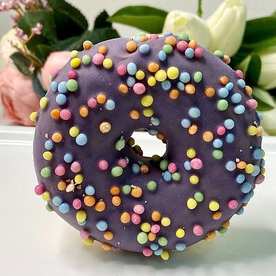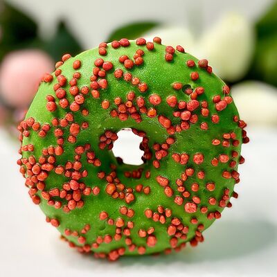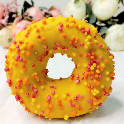 Донат с начинкой из манго, декорированный жёлтой глазурью и цветной посыпкой