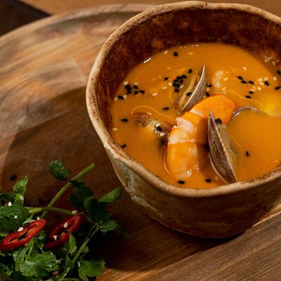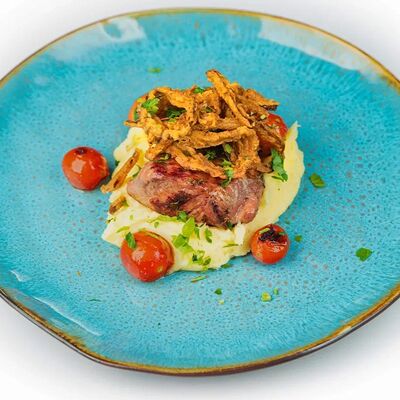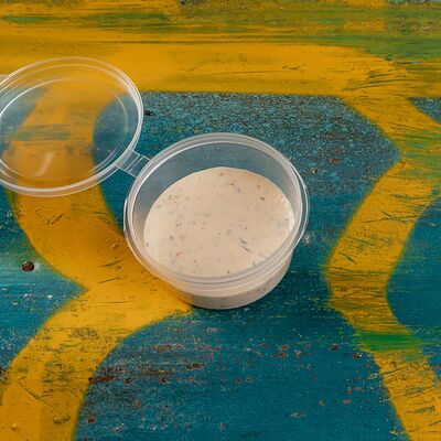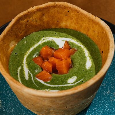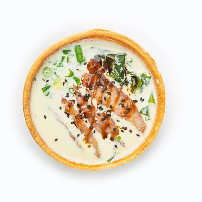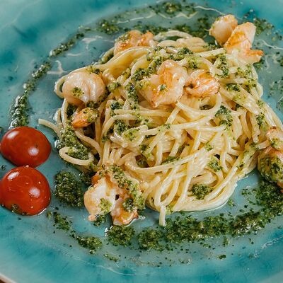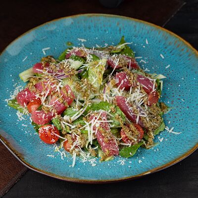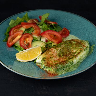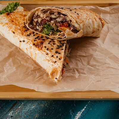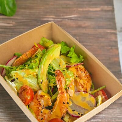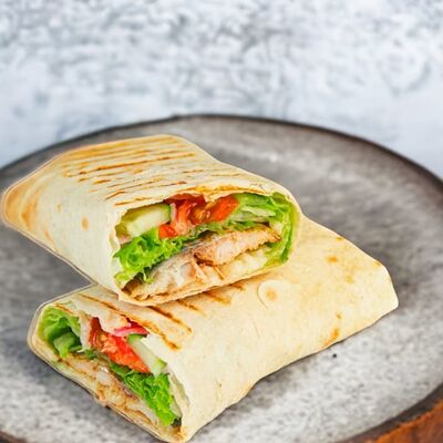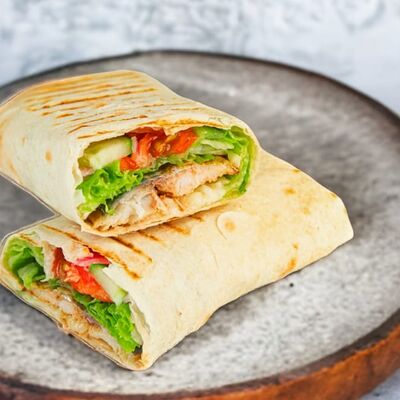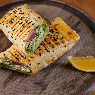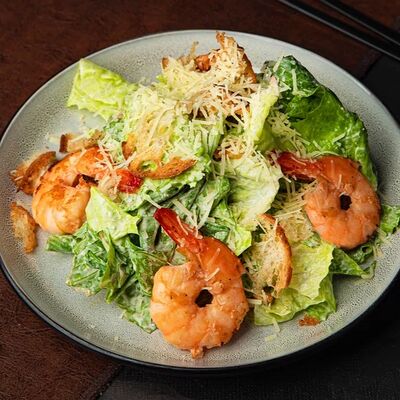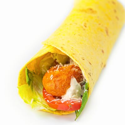 Тортилья сырная, салат, помидор, пармезан, соус цезарь, креветка темпура