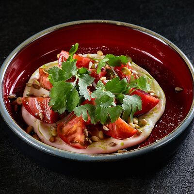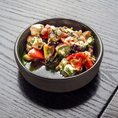 Салат с хрустящими баклажанами и розовыми томатами доставка