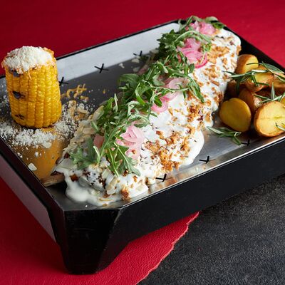 Хрустящие баклажаны в крахмальной панировке, томаты, сыр фета, арахис, зелень, базилик, кунжут, соус сладкий чили с кунжутным маслом