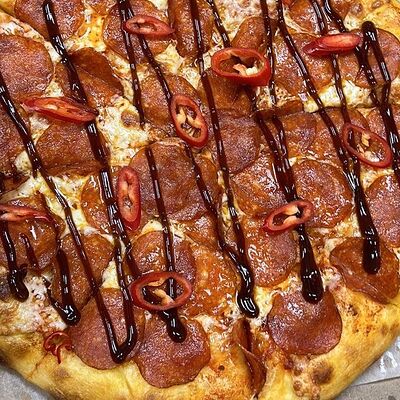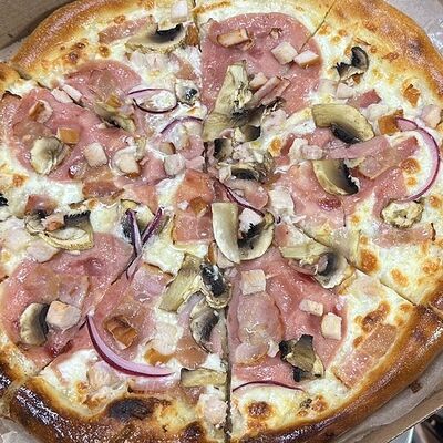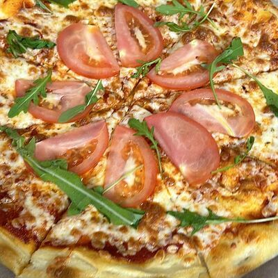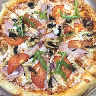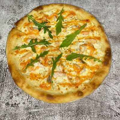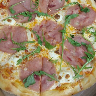Соус фирменный, сыр моцарелла, ветчина, сыр творожный, рукола, тесто (30 см)