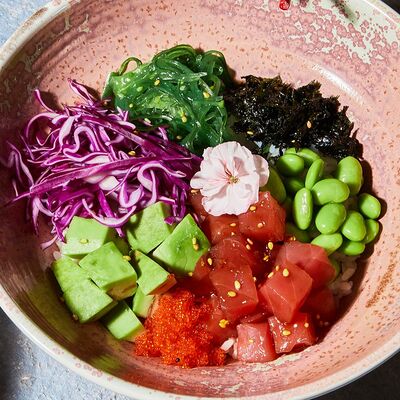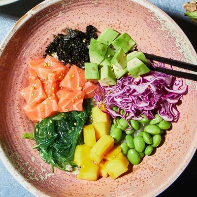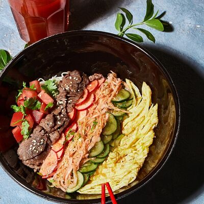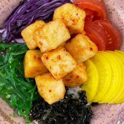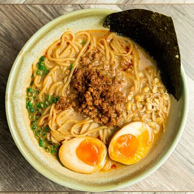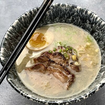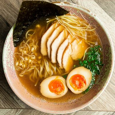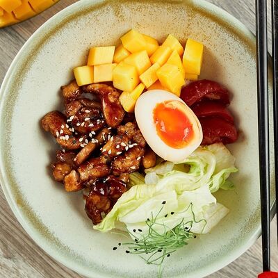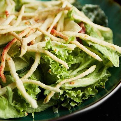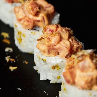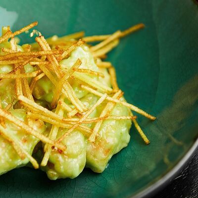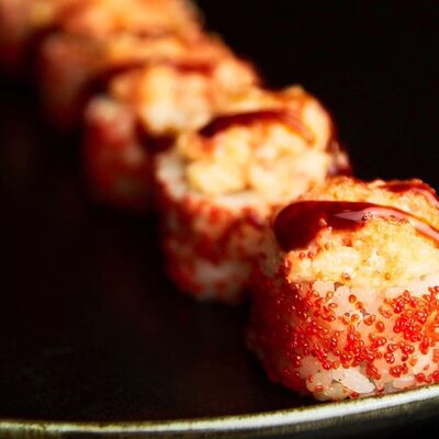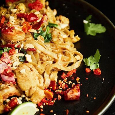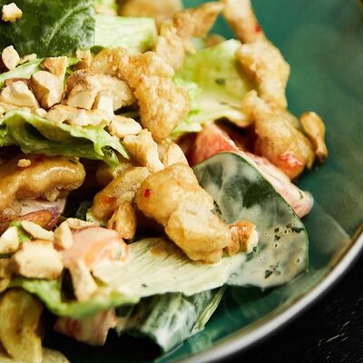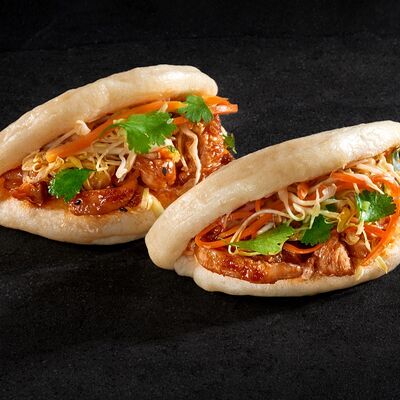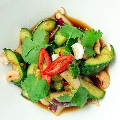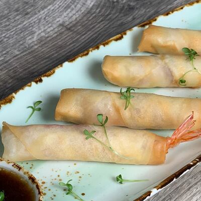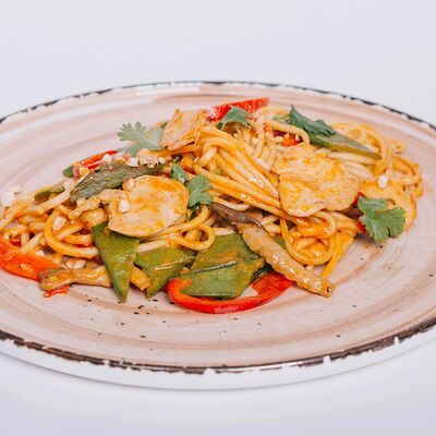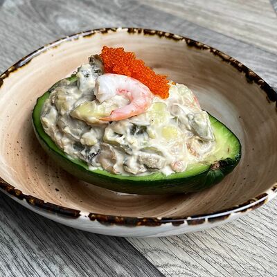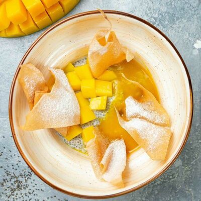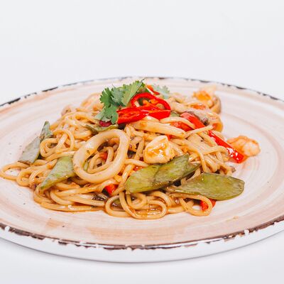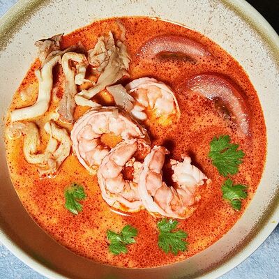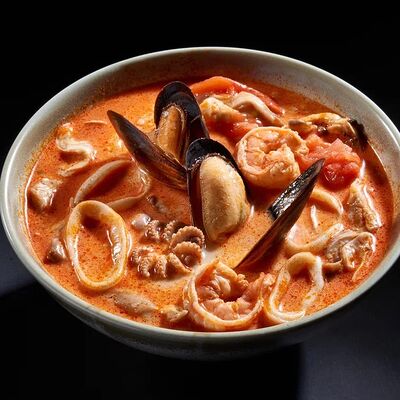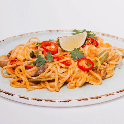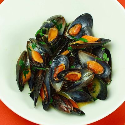 Мидии, соус том ям, лук, кинза, лайм, чиабатта