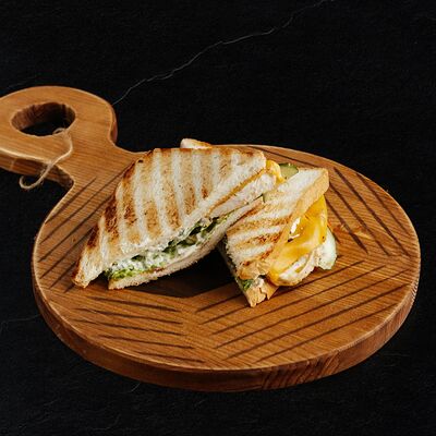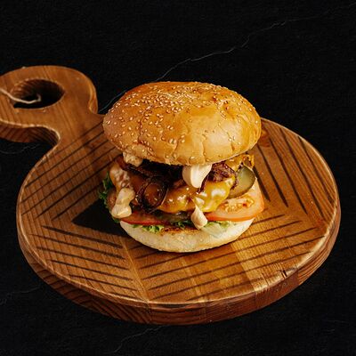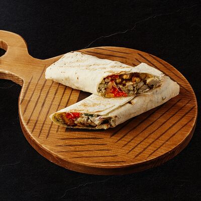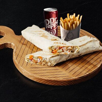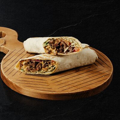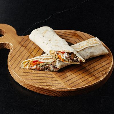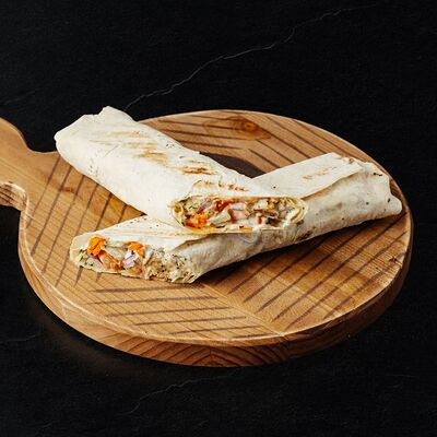 Лаваш, куриное филе, салат, огурец свежий, помидор, морковь по-корейски, лук красный, фирменные соусы