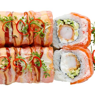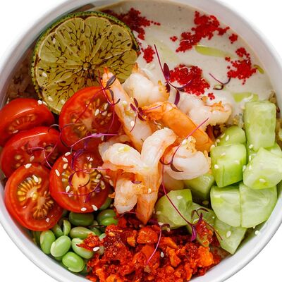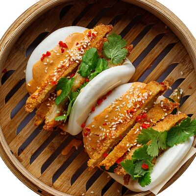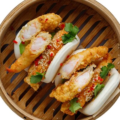 Булочка бао, креветка, огурец маринованный, соус спайси, соус ореховый кокос