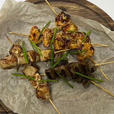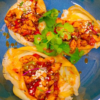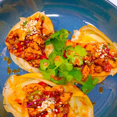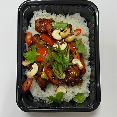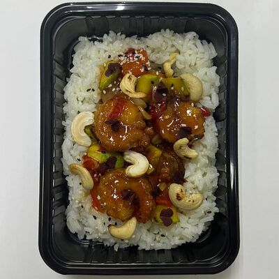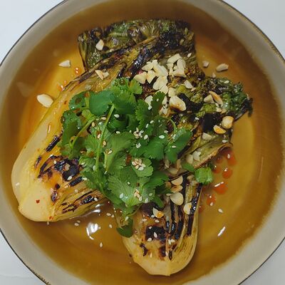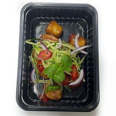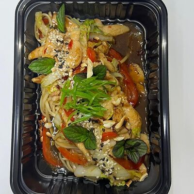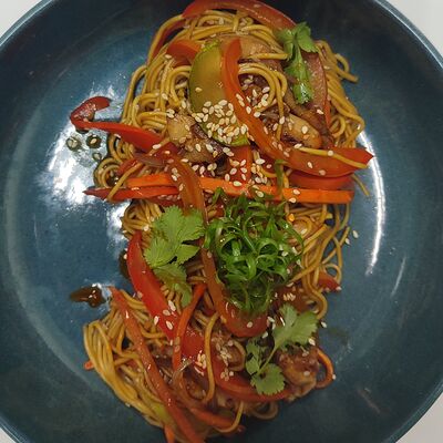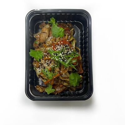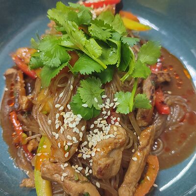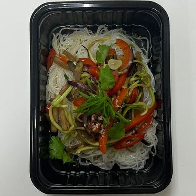Фунчоза, масло кунжутное, цукини, баклажаны, перец болгарский, лук, кинза, соевый соус, устричный соус, чеснок