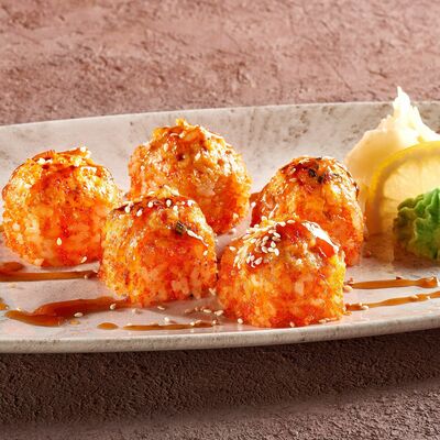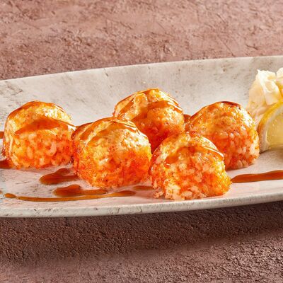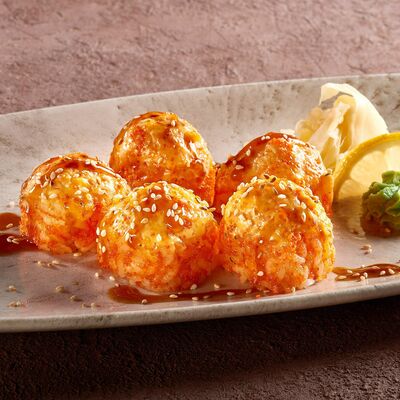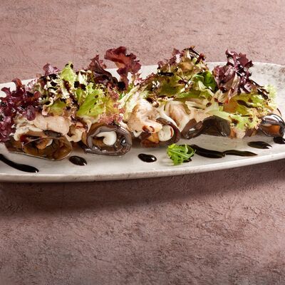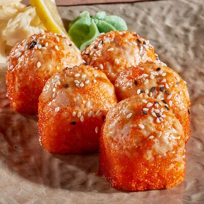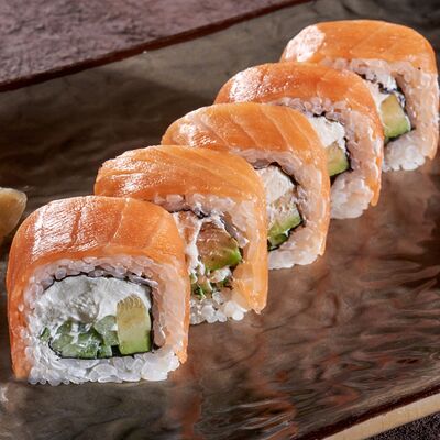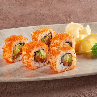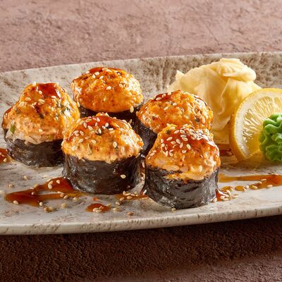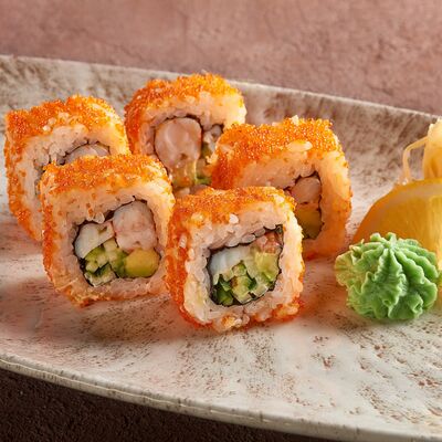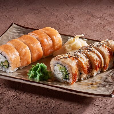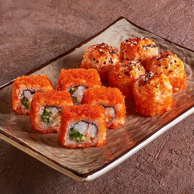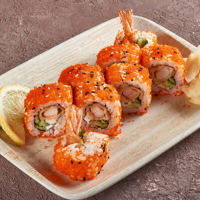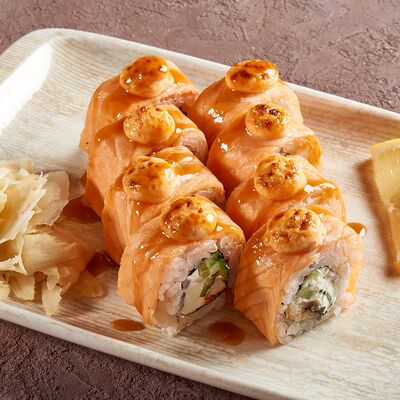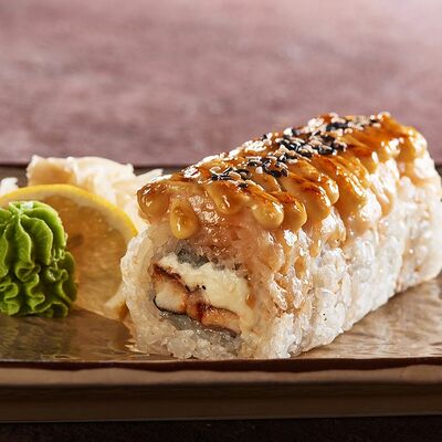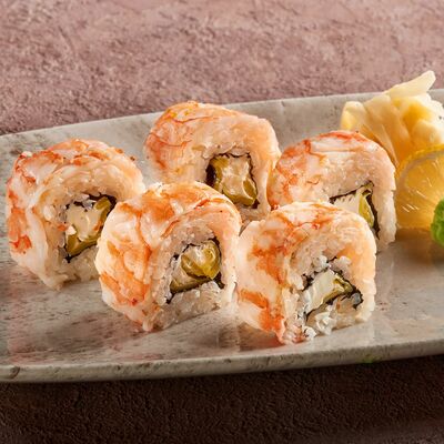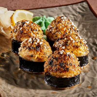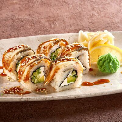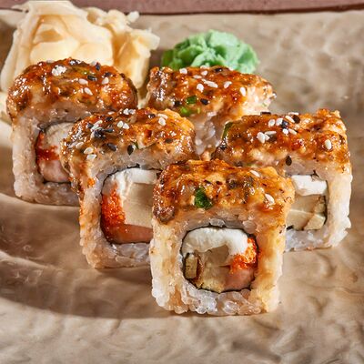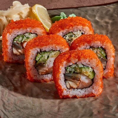 Рис, нори, угорь, сыр творожный креметте, лук зеленый, креветка, соус спайси, соус унаги, кунжут, масаго (5 шт.) имбирь, васаби