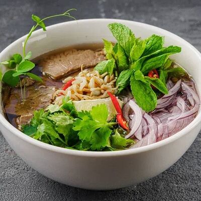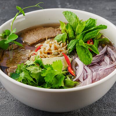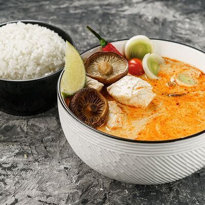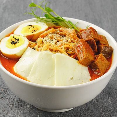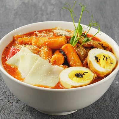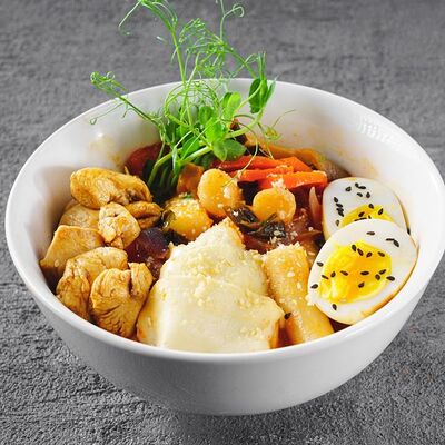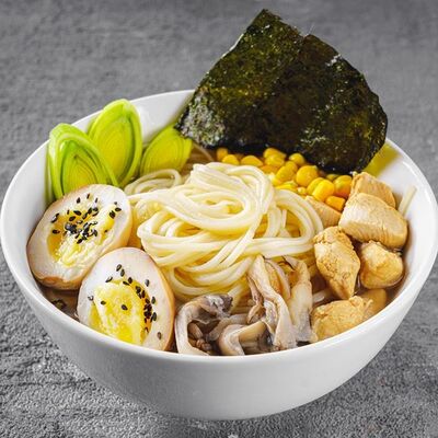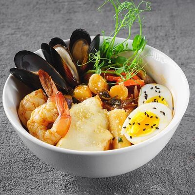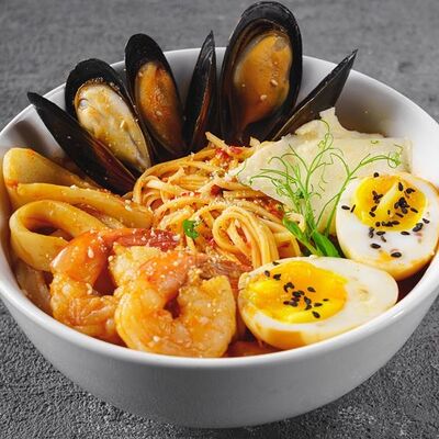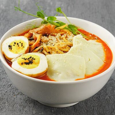 Лапша рамен, куриное яйцо, водоросли, грибы, сыр, зелень, фирменный соус Побо. Острое блюдо