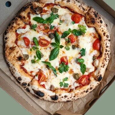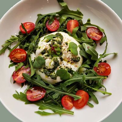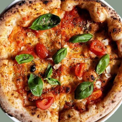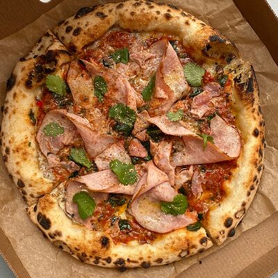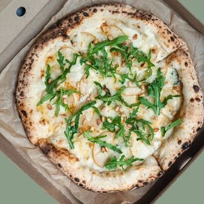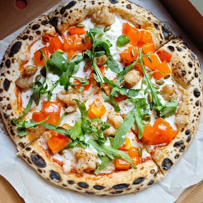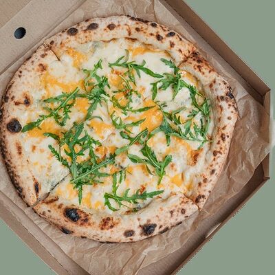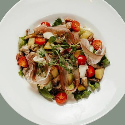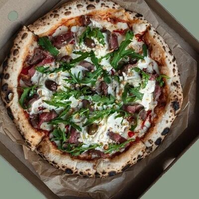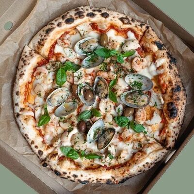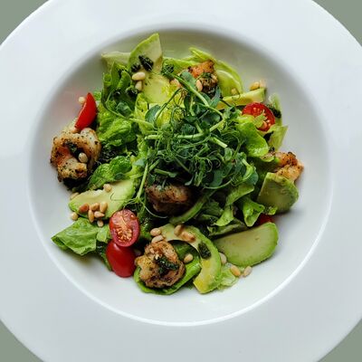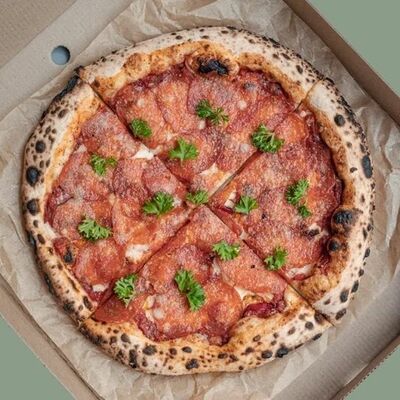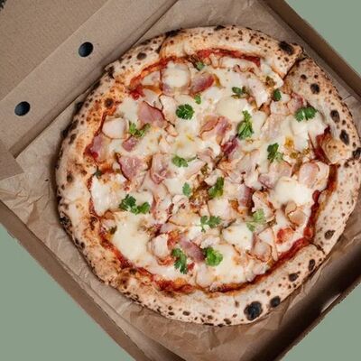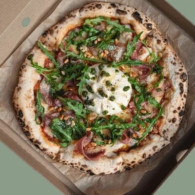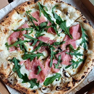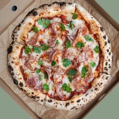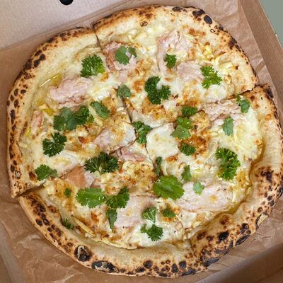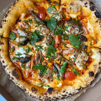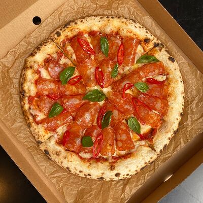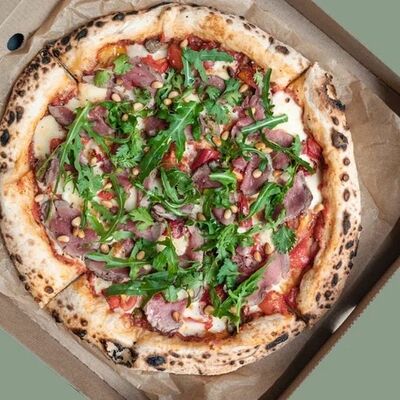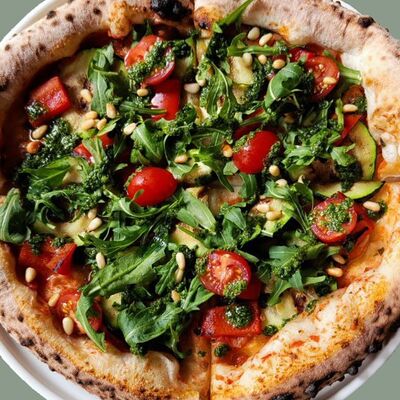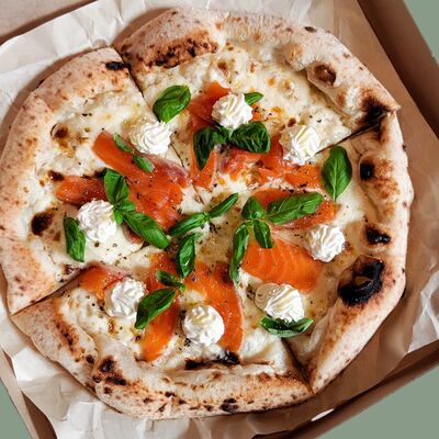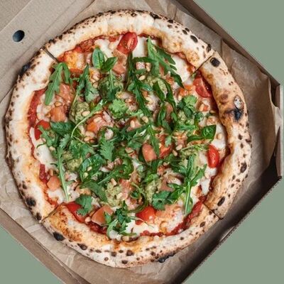 Соус томатный, лосось подкопченный, гуакамоле, моцарелла, томаты черри, кинза, базилик, орех кедровый, руккола, масло оливковое
