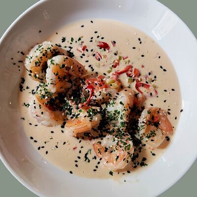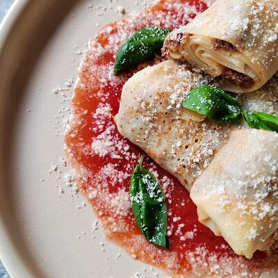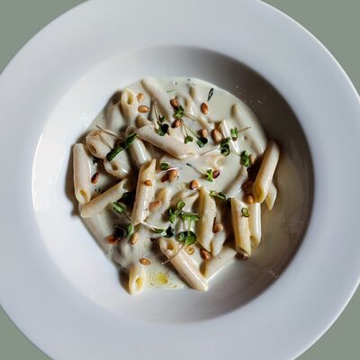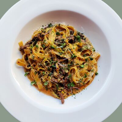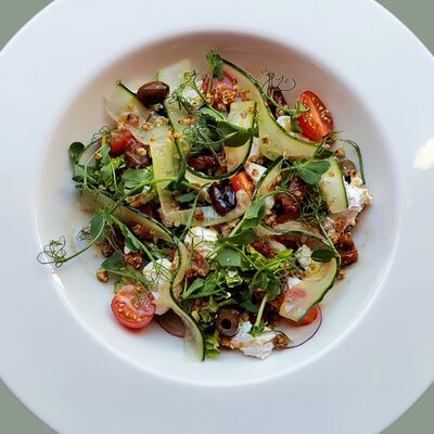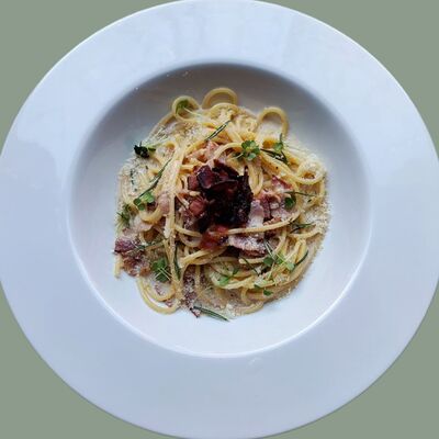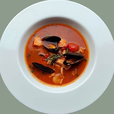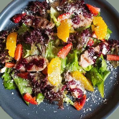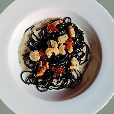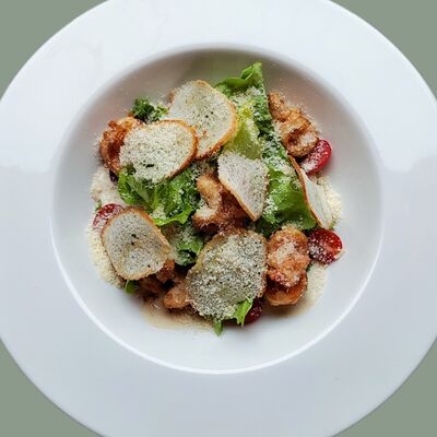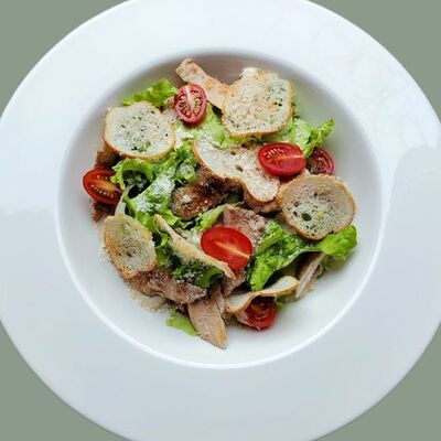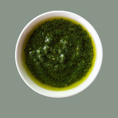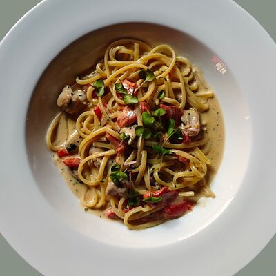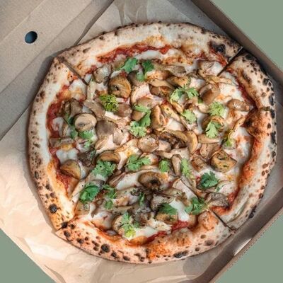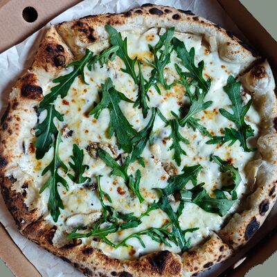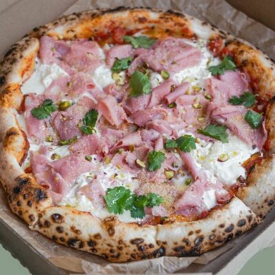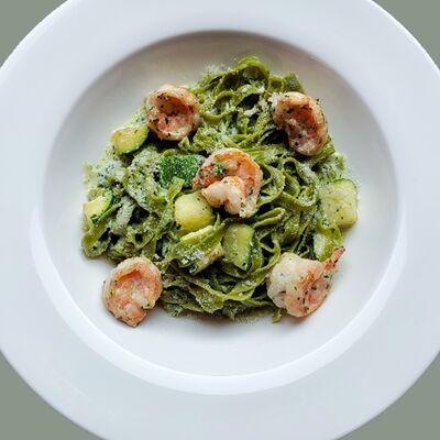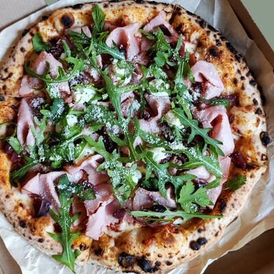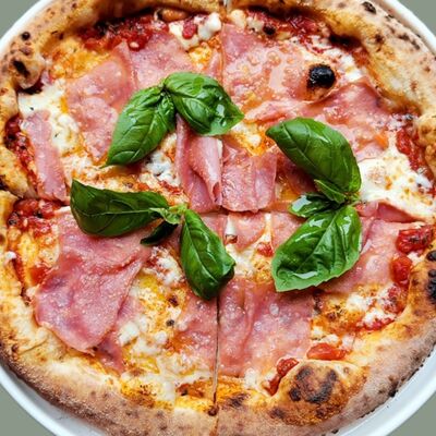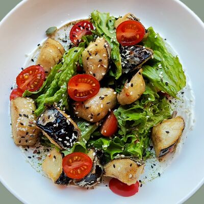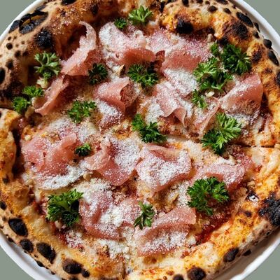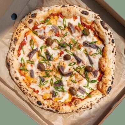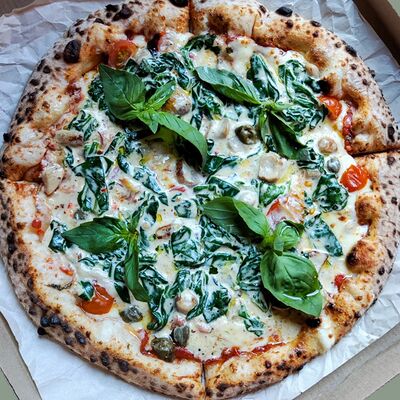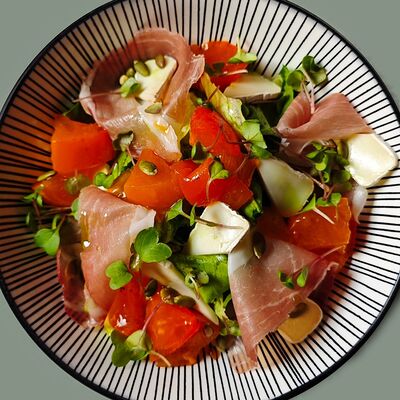 Соус томатный, лосось подкопченный, гуакамоле, моцарелла, томаты черри, кинза, базилик, орех кедровый, руккола, масло оливковое