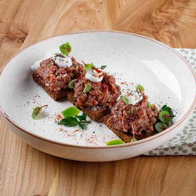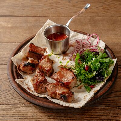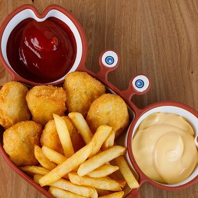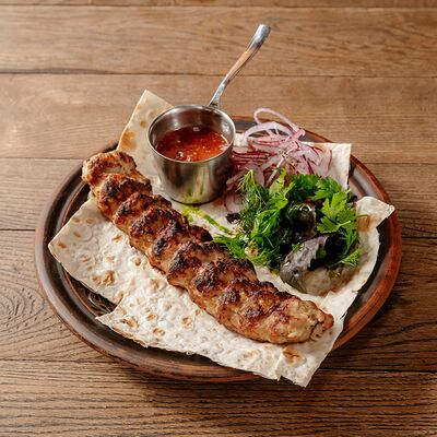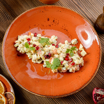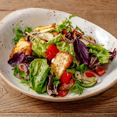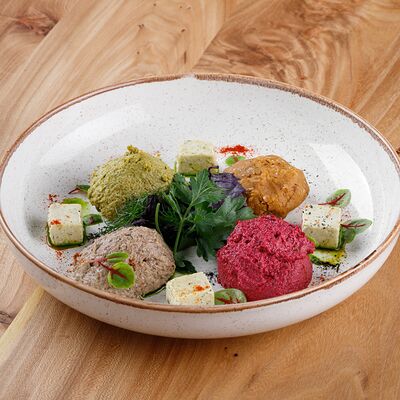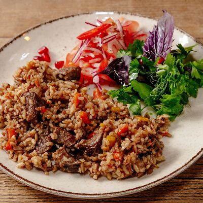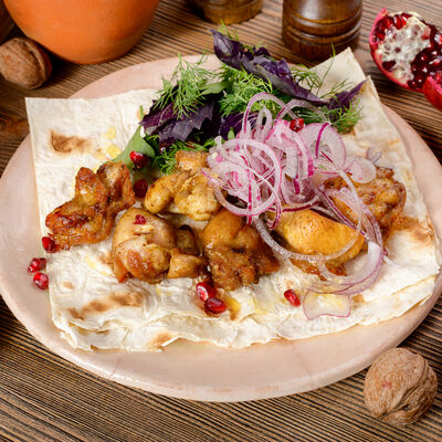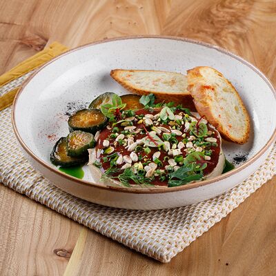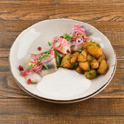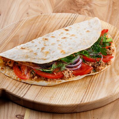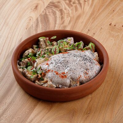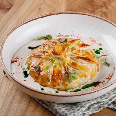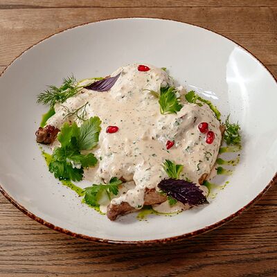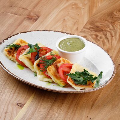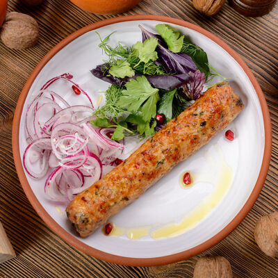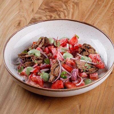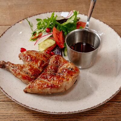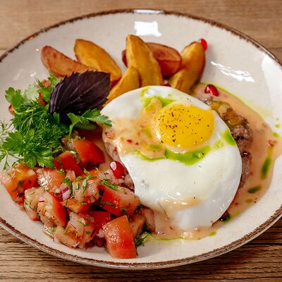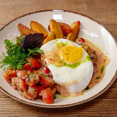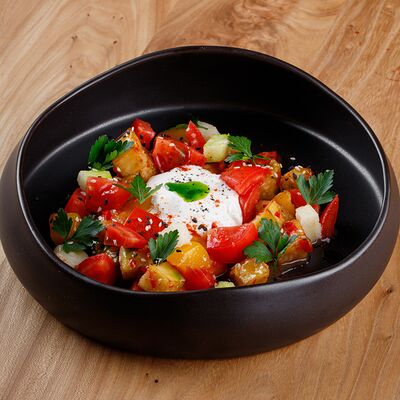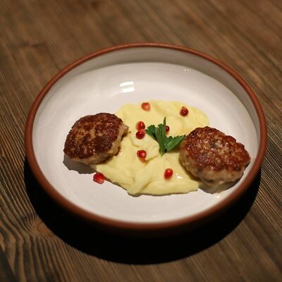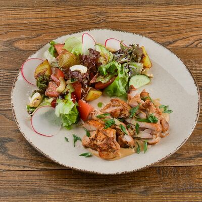 Фарш из курицы, картофельное пюре (картофель, молоко, сливочное масло), огурец, помидор