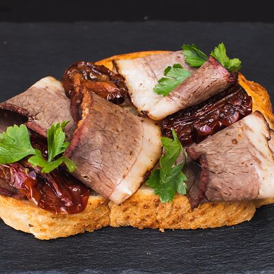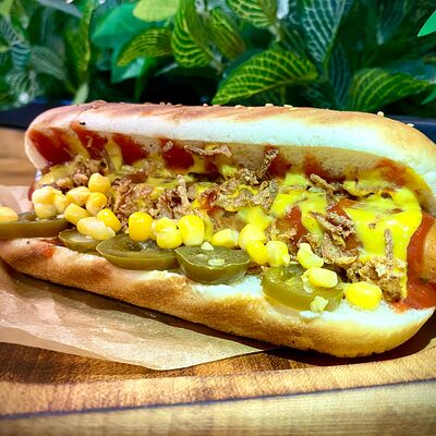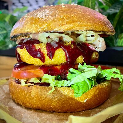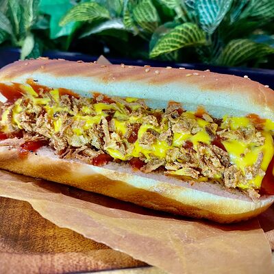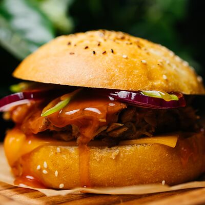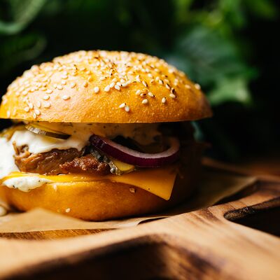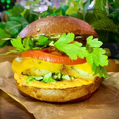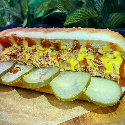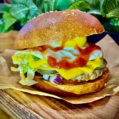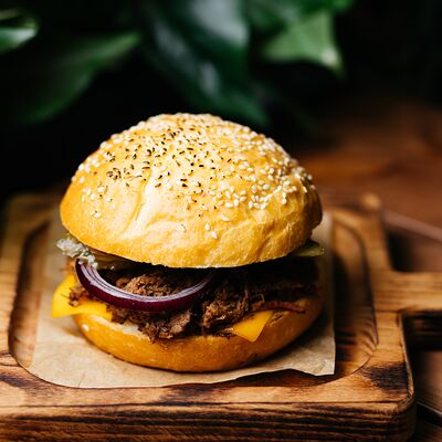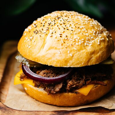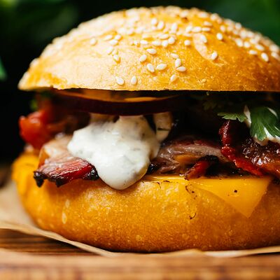 Булочка бриошь, куриное мясо, свежие томаты, соленые огурец, красный лук, соус сливочный
