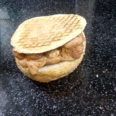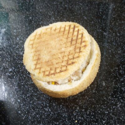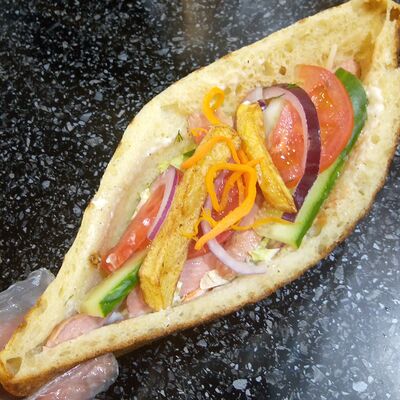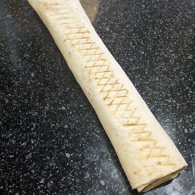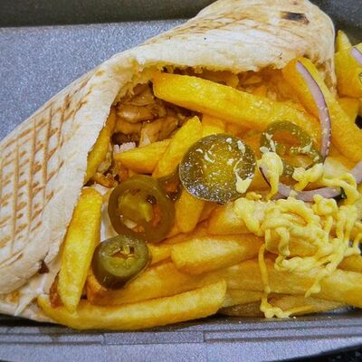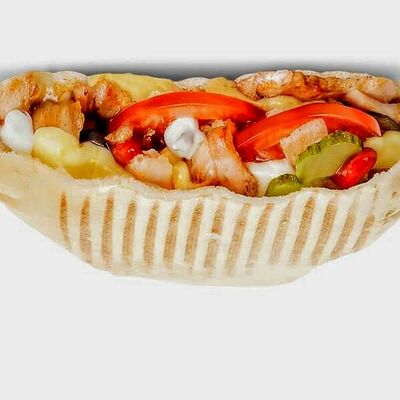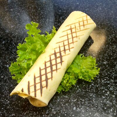 Лепешка кукурузная текста, мяса куриная, лист салата, огурцы, помидоры, маслины, кукуруза, соус честночный, кетчуп