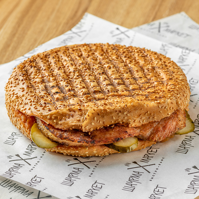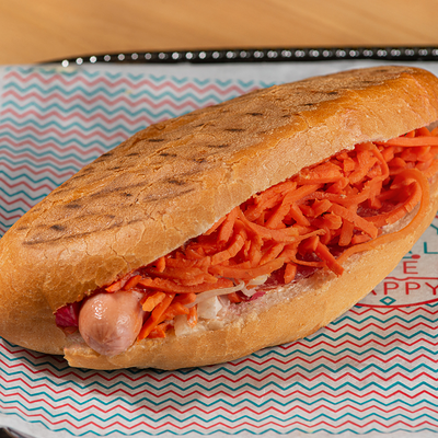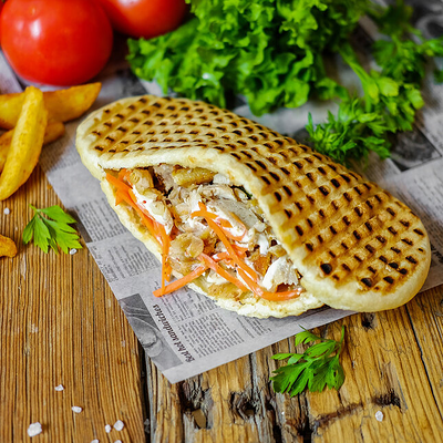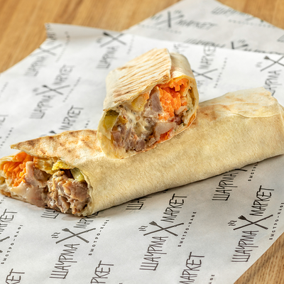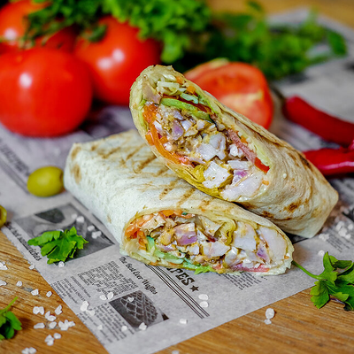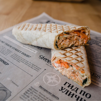 Фирменный соус, курица, запеченная в духовке, свежие помидоры, морковь, пекинская капуста, свежий огурец, кетчуп