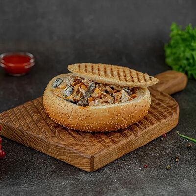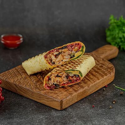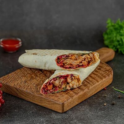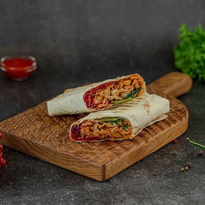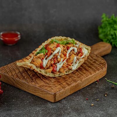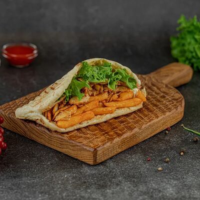 Филе куриное, картофель фри, свежие помидоры, огурцы маринованные, салат фирменный, соус фирменный, сырная тортилья