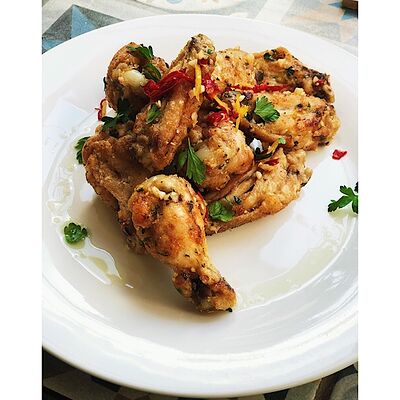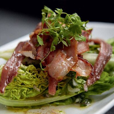 Салат латук, лук шалот, зелёный лук, анчоусы, панчетта, петрушка, оливковое масло, хересный уксус
