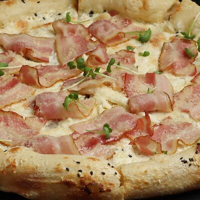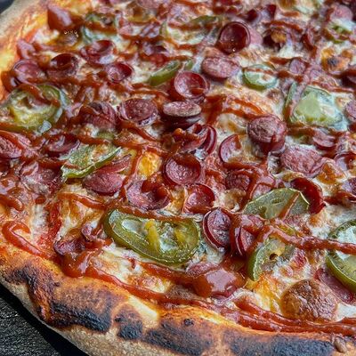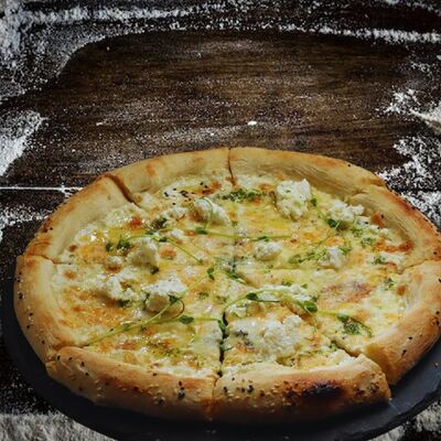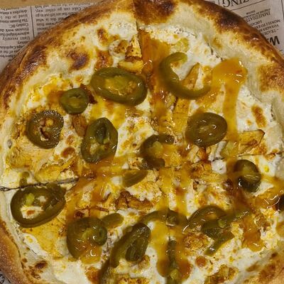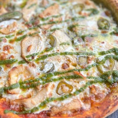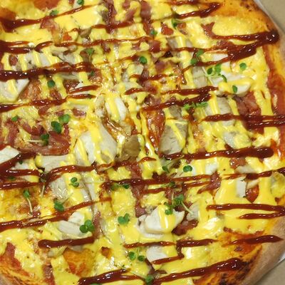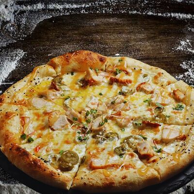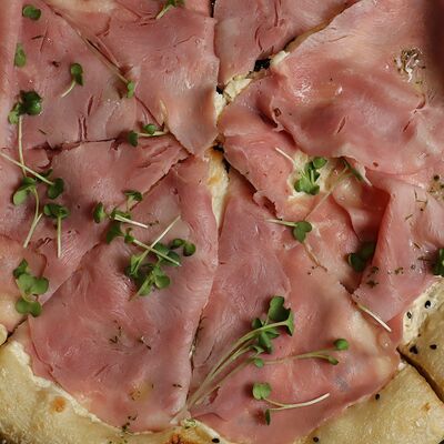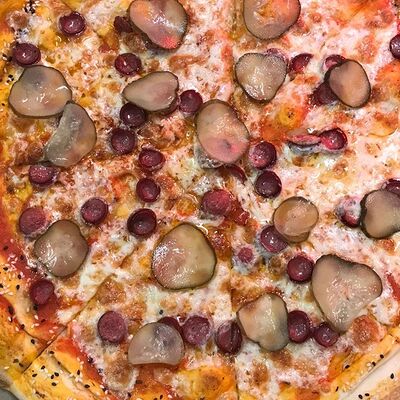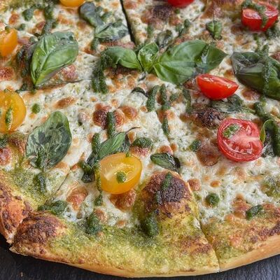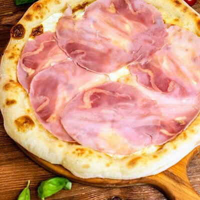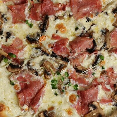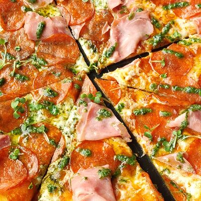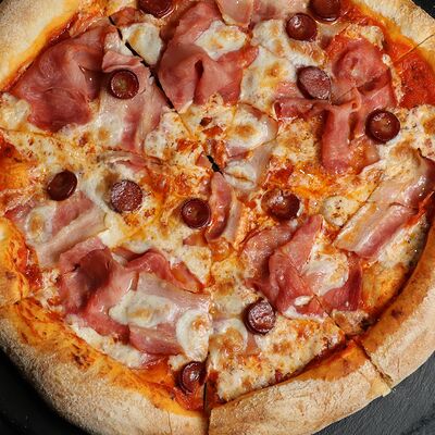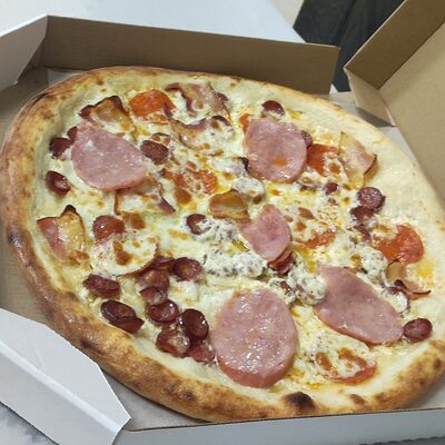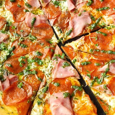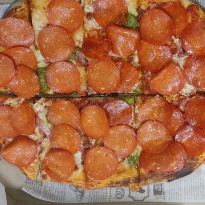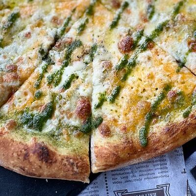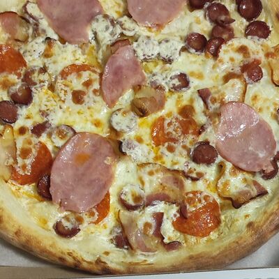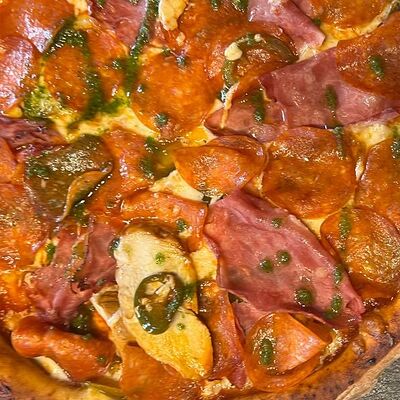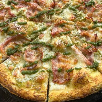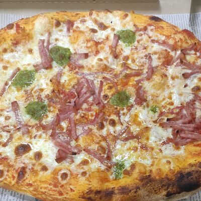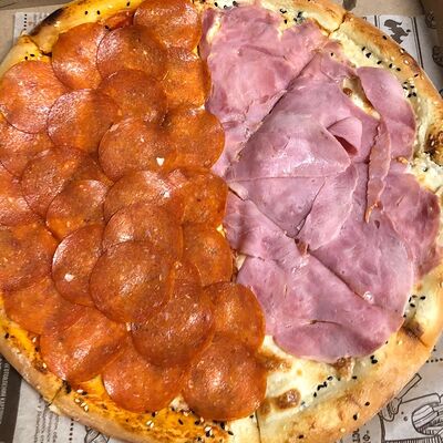 Вкусное тесто, в меру тонкое и хрустящее. Одна половина основы с соусом ромеско, другая половина с соусом песто и нежным базиликом. Сыр моцарелла, ветчина, пепперони. Подается с соусом ромеско из запеченных овощей, болгарским перцем и томатом (35 см)