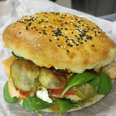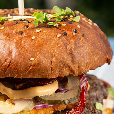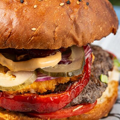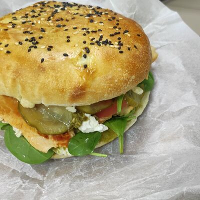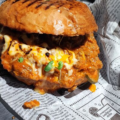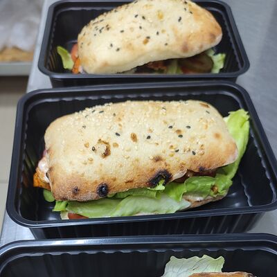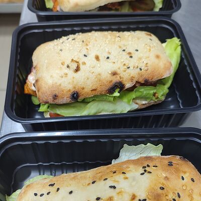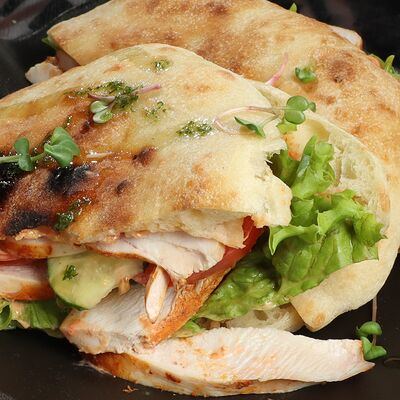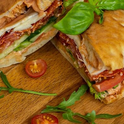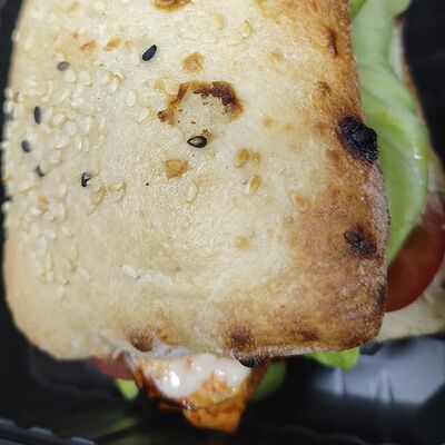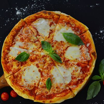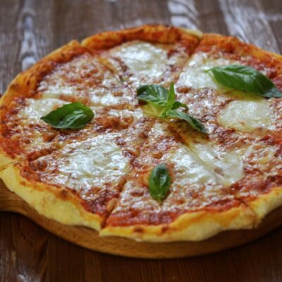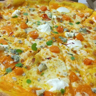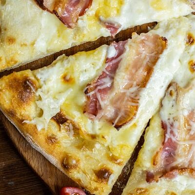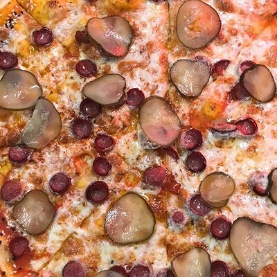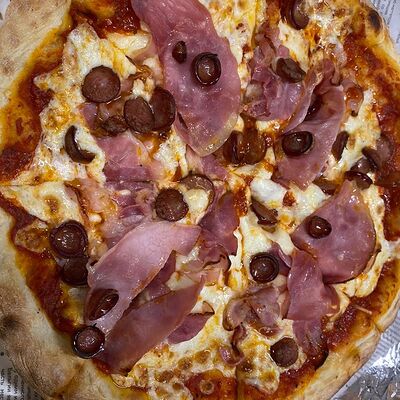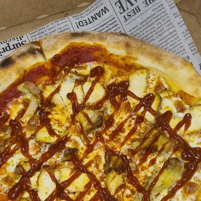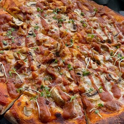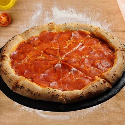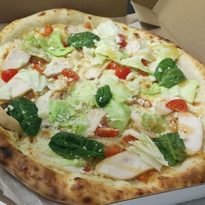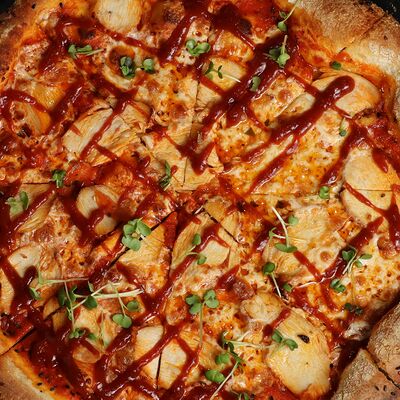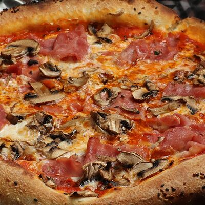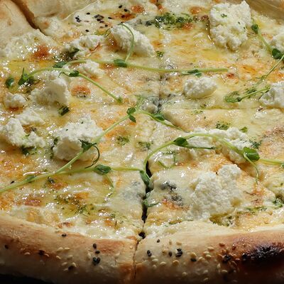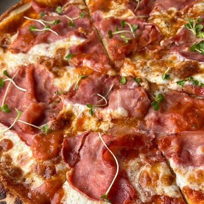 Вкусное тесто, в меру тонкое и хрустящее. Одна половина основы с соусом ромеско, другая половина с соусом песто и нежным базиликом. Сыр моцарелла, ветчина, пепперони. Подается с соусом ромеско из запеченных овощей, болгарским перцем и томатом (35 см)