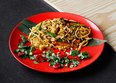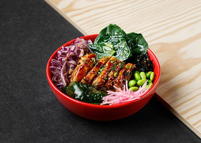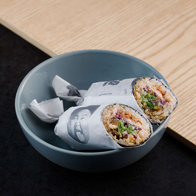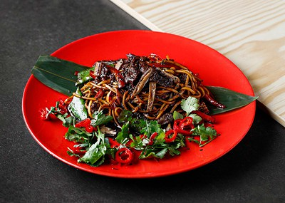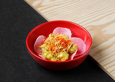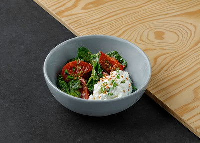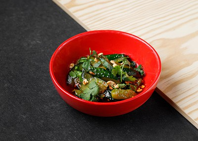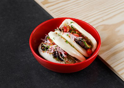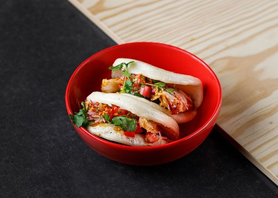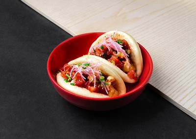 Пшеничные булочки, говядина, карамельный соус, битые огурцы, томаты, кинза, редис, зеленый лук, кунжут кимчи