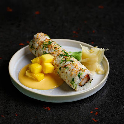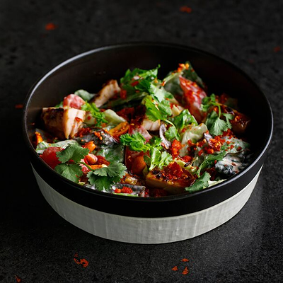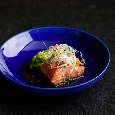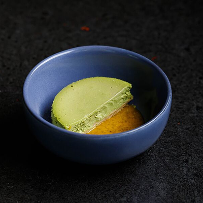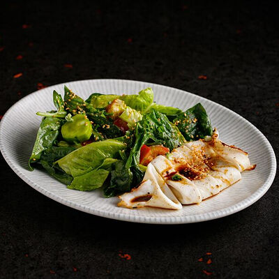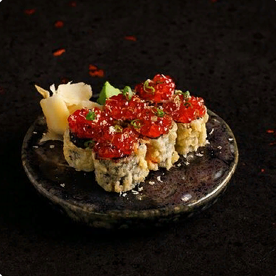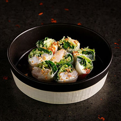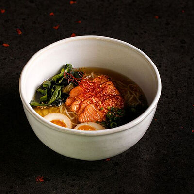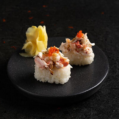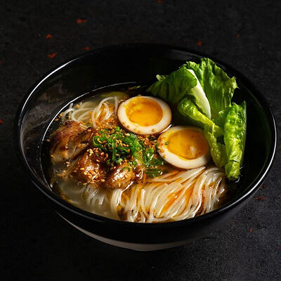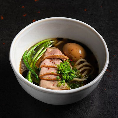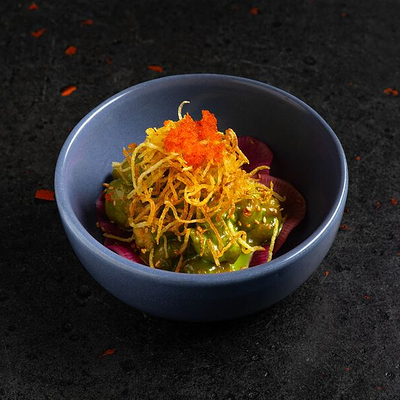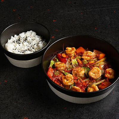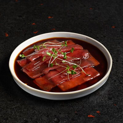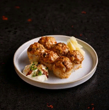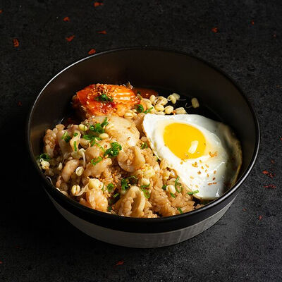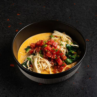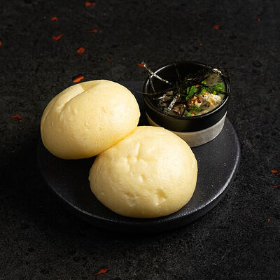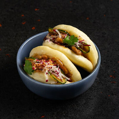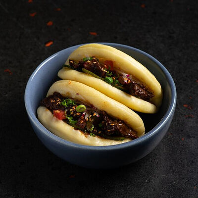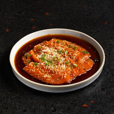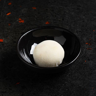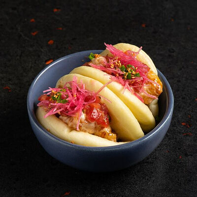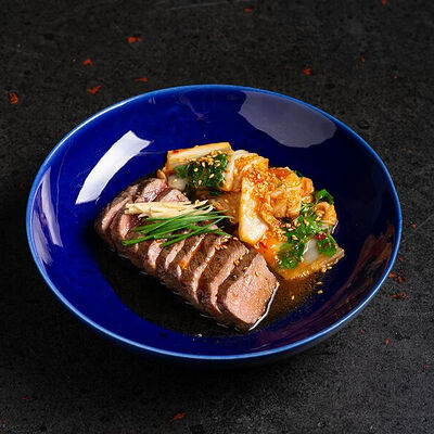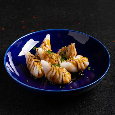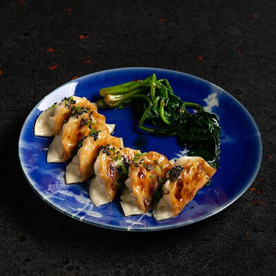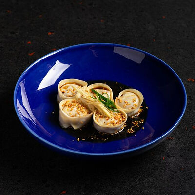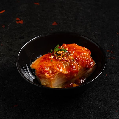 Фарш говяжий с добавлением острой капусты кимчи, овощей и специй в азиатском стиле, соус для пельменей на основе куриного бульона с соевым соусом и уксусом, лук зеленый, корень имбиря, острый кунжут кимчи