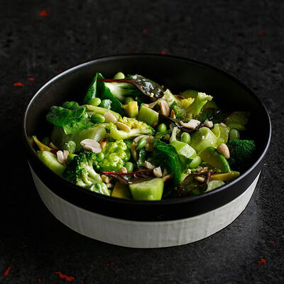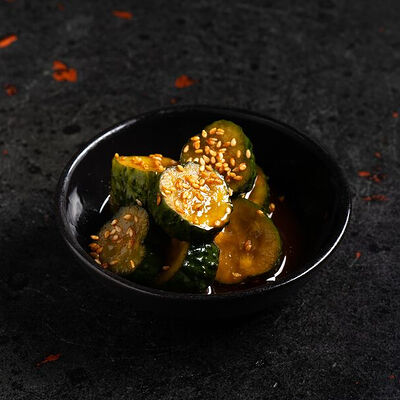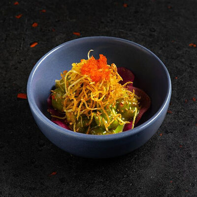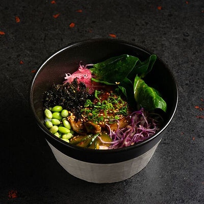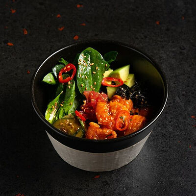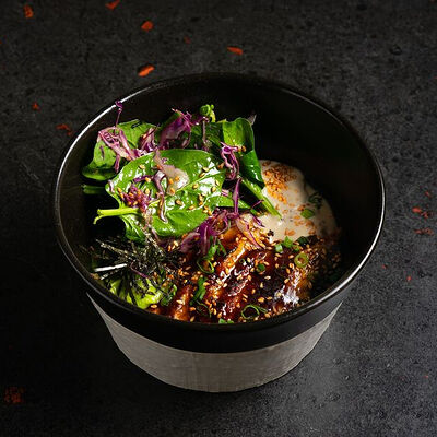 Рис, угорь в соусе терияки, опаленный огнем, соус умами, лук зеленый, васаби, острый кунжут кимчи