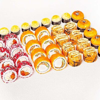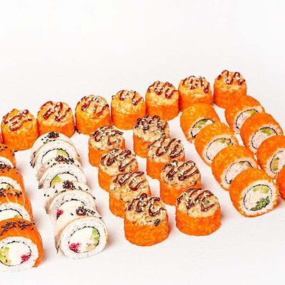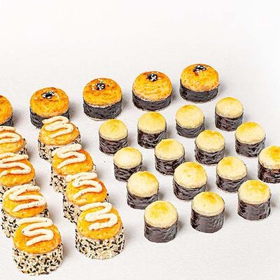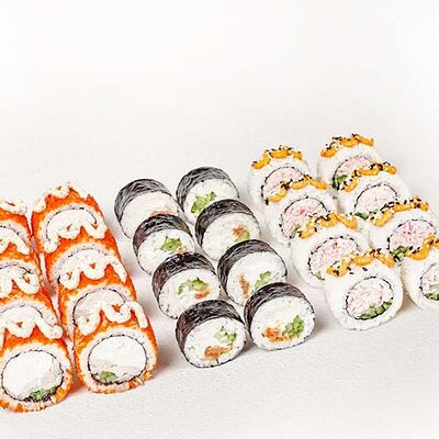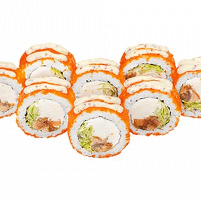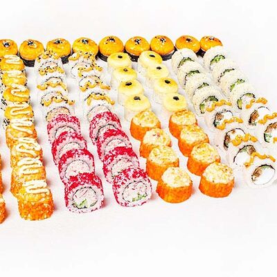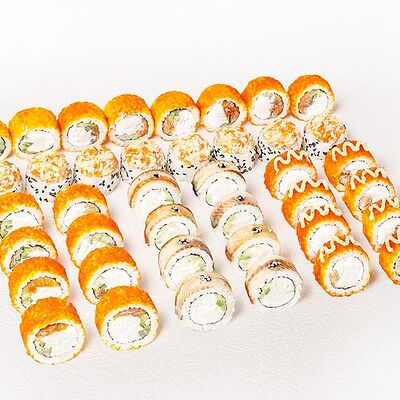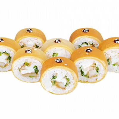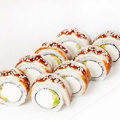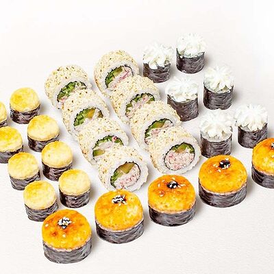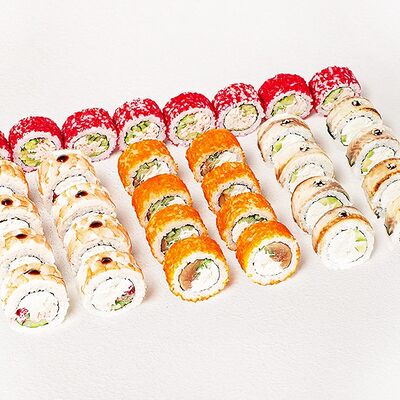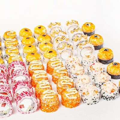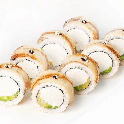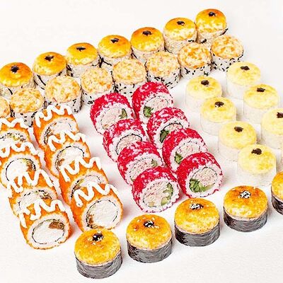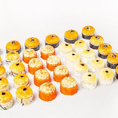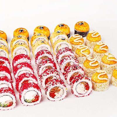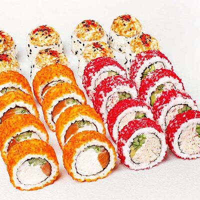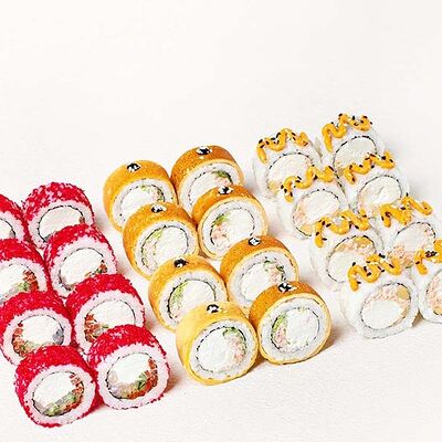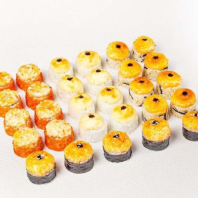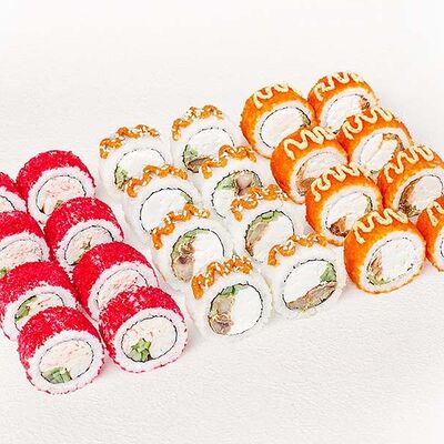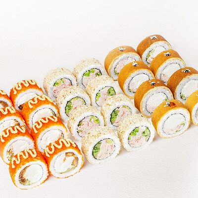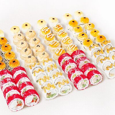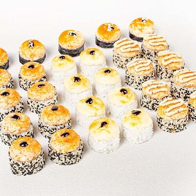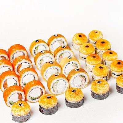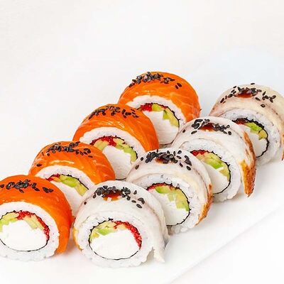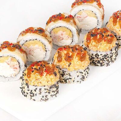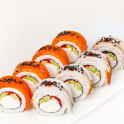Запеч. Ролл Медовая креветка, запеч. Ролл Сырный, запеч. Ролл Хоккайдо, запеч. Ролл Лосось унаги, ролл Азия Чикен, ролл Калифорния в масаго, ролл Окунь Тай, ролл Сэнсей, ролл Креветка Фреш
