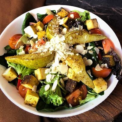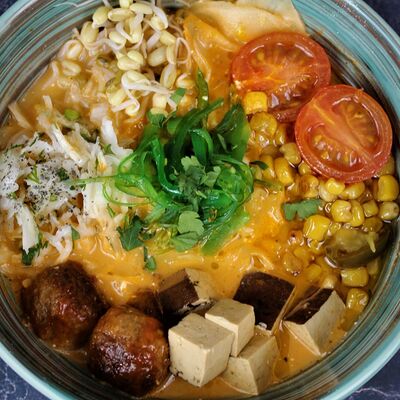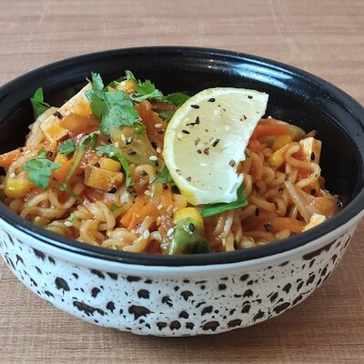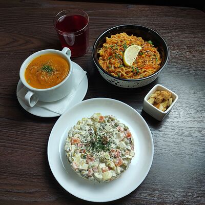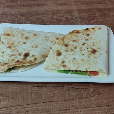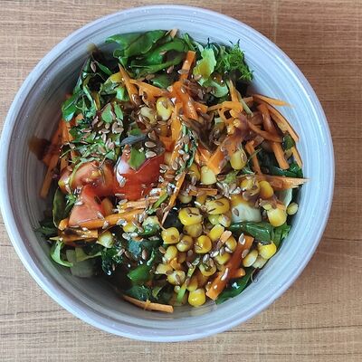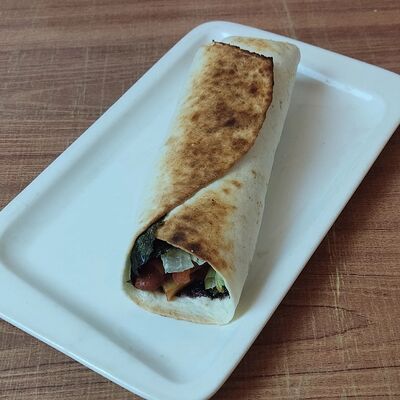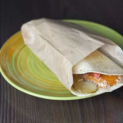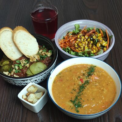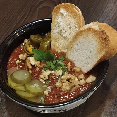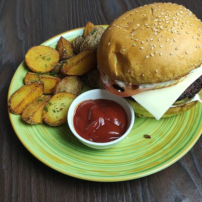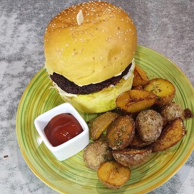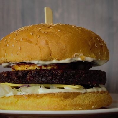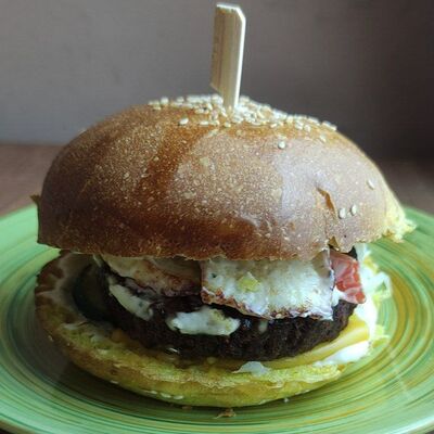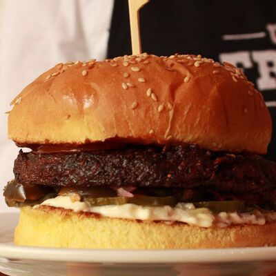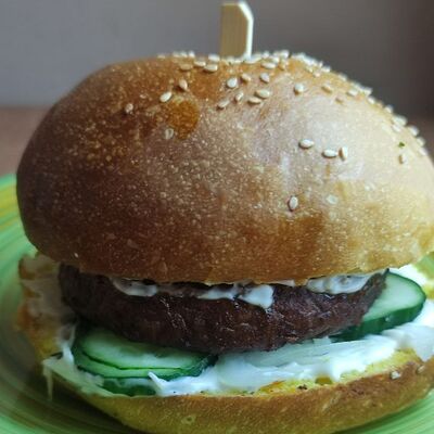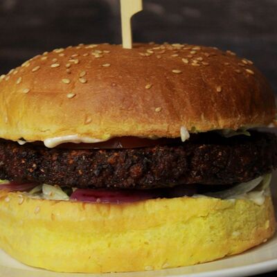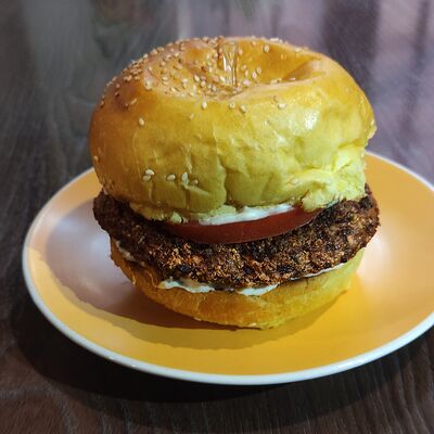 Овощная котлета, бургер соус, соус сальса, шрирача, болгарский перец, салат, маринованный огурец, маринованный лук, халапеньо