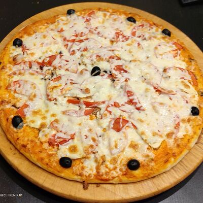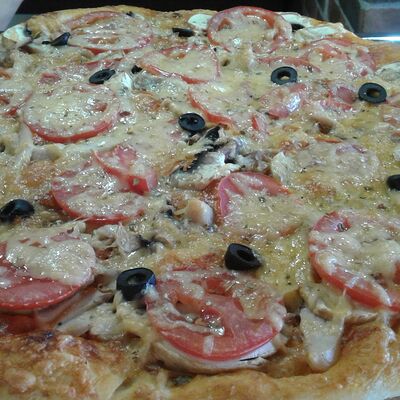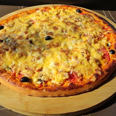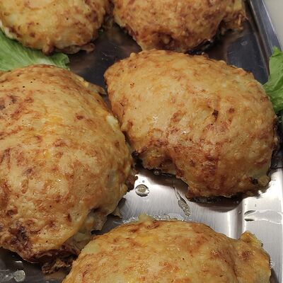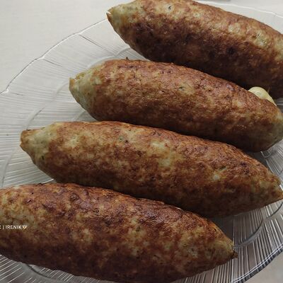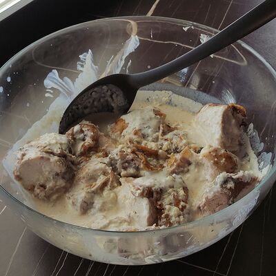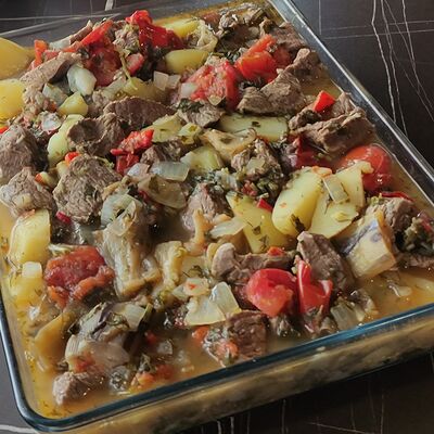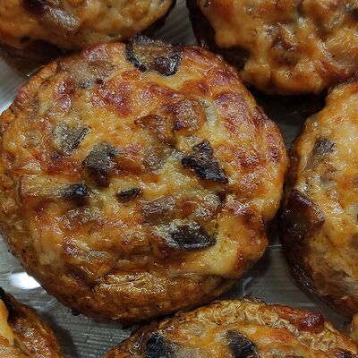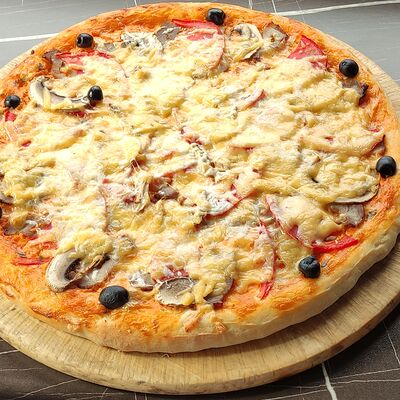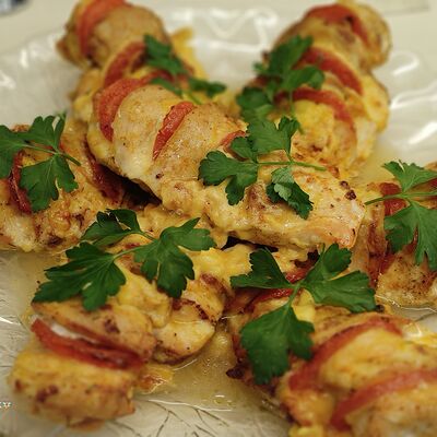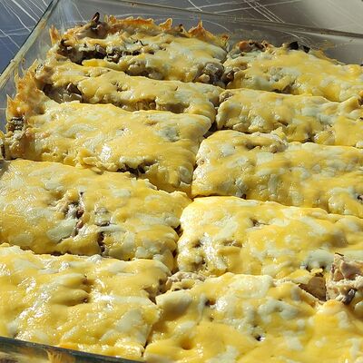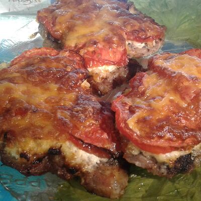 Cвинoй карбонад, картофель, сметана, помидоры свежие, лук, яйцо, мука пшеничная, соль, перец черный молотый, сыр российский, грибы, масло подсолнечное