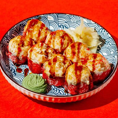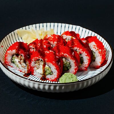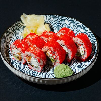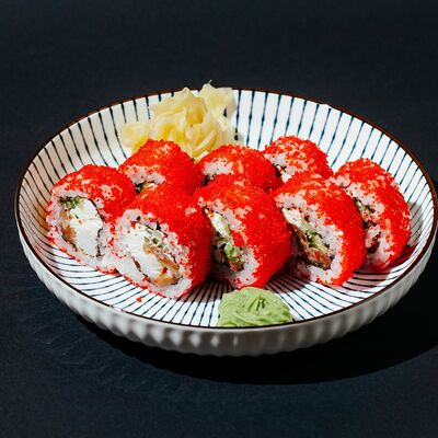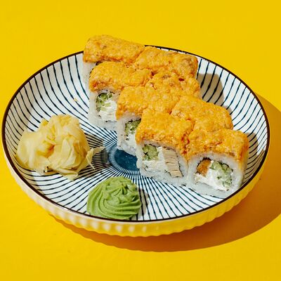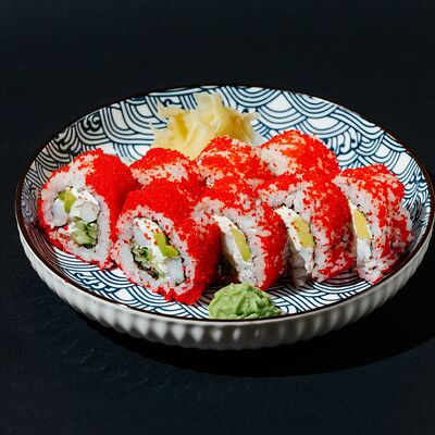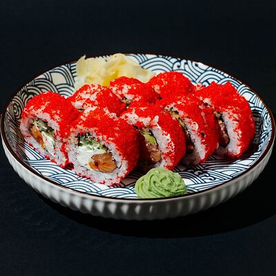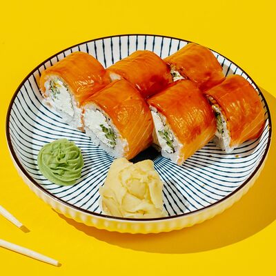 Копченый лосось, моцарелла, майонез, зеленый лук, творожный сыр, огурец, японский омлет, рис, нори