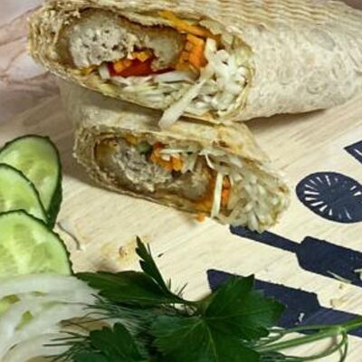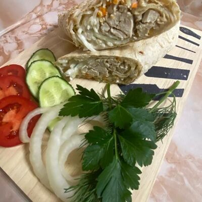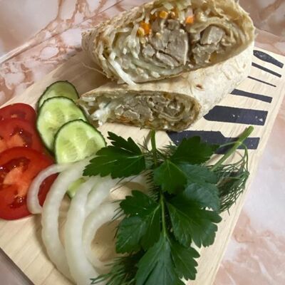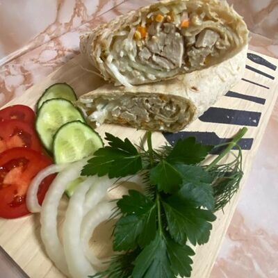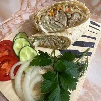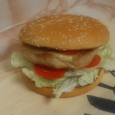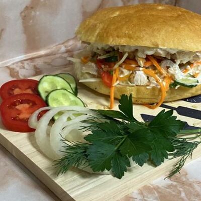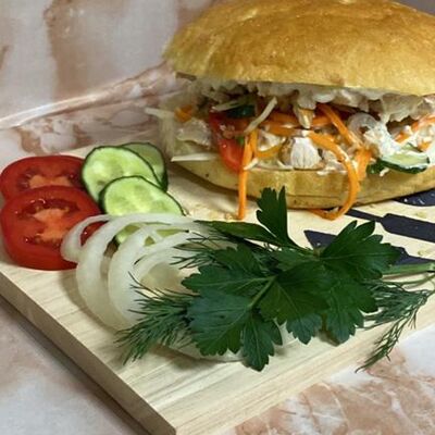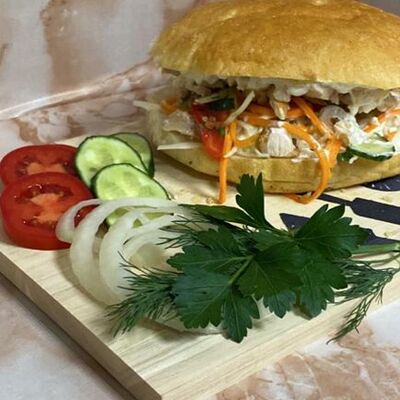 Булочка, курица (приготовление на открытом огне), капуста, морковь по-корейски, помидоры, огурцы, зелень, лук, соус чесночный фирменный. (При выборе добавки картошка фри в капуста не входит)