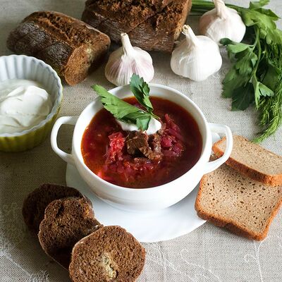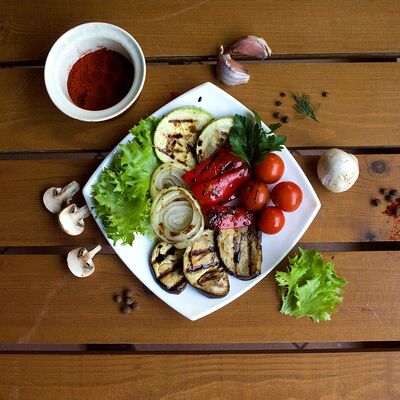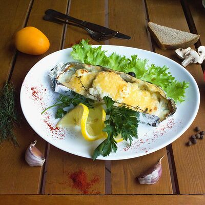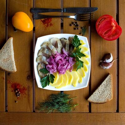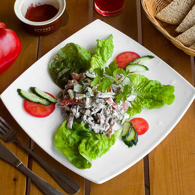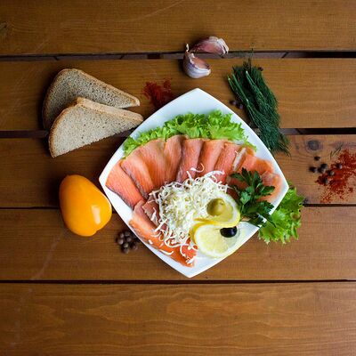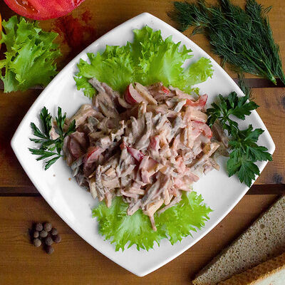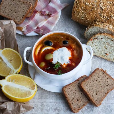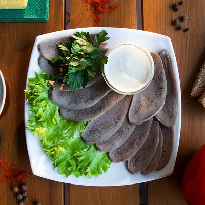 Говядина, язык, сосиски и грудинка с солеными огурчиками, маслинами и лимоном