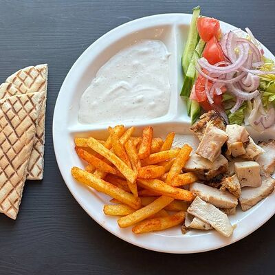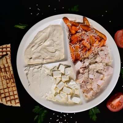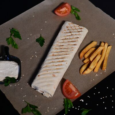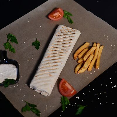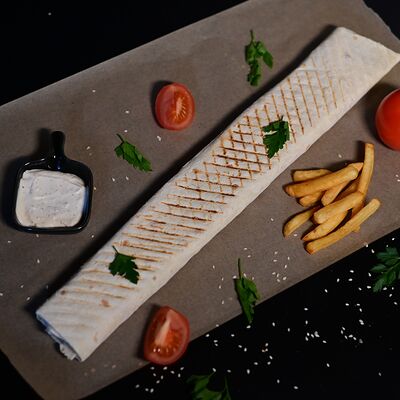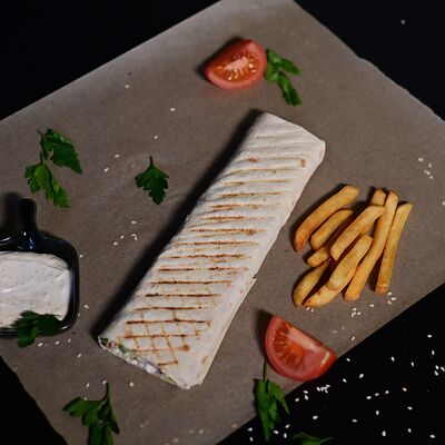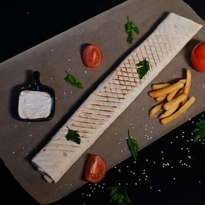 Пита, куриный шашлык, картофель фри, сыр Cremette, сыр моцарелла, соус чесночный