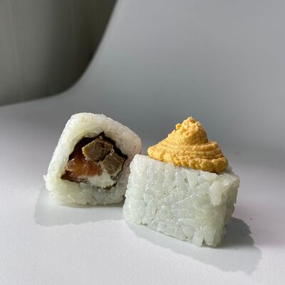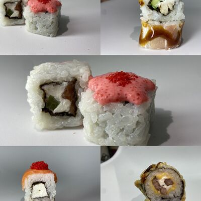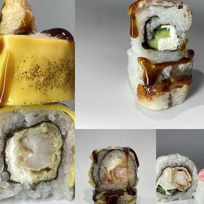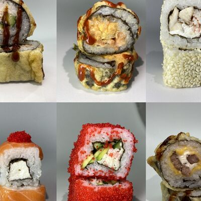 Ниппон (нори, рис, кляр, тунец гриль, творожный сыр, сыр чеддер, унаги-соус), Филадельфия (нори, рис, творожный сыр), Сакура (нори, рис, курица гриль, творожный сыр, снежный краб, кунжут, унаги-соус), Калифорния (нори, рис, огурец, авокадо, снежный краб, икра тобико), Циклон (нори, рис, лосось, угорь, кляр, соус вихрь), Самум (нори, рис, курица гриль, снежный краб, огурец, кляр, унаги-соус)