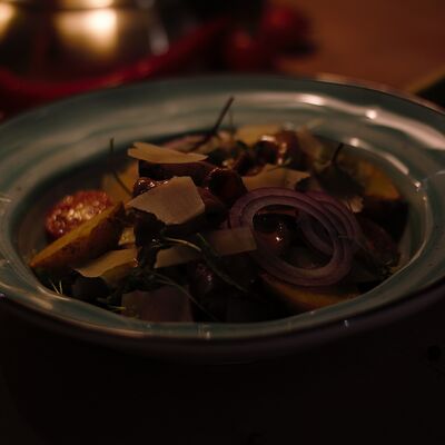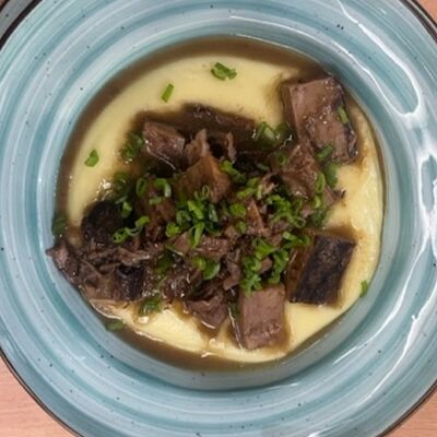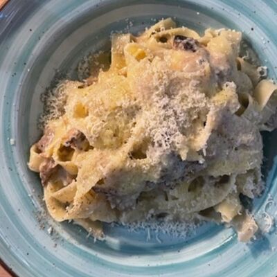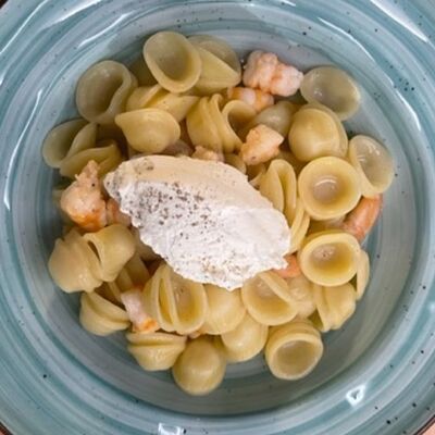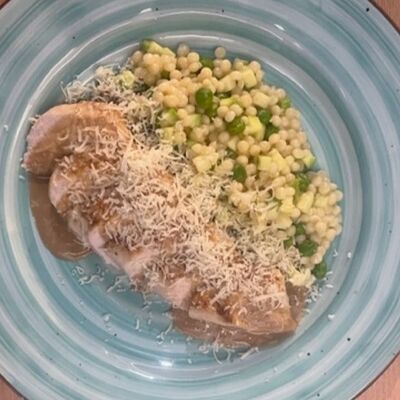 Грудка су-вид, сливки, демиглас-соус, птитим, кабачки, горошек зеленый, вино белое, масло сливочное, сыр пармезан