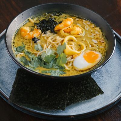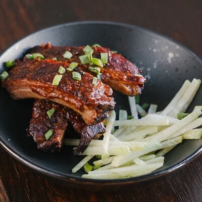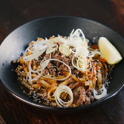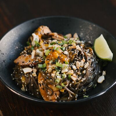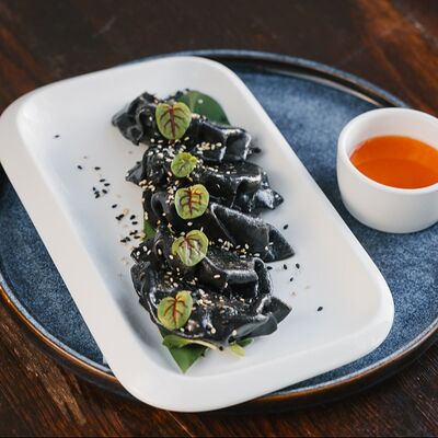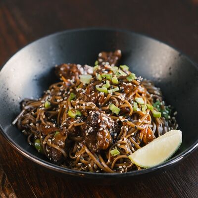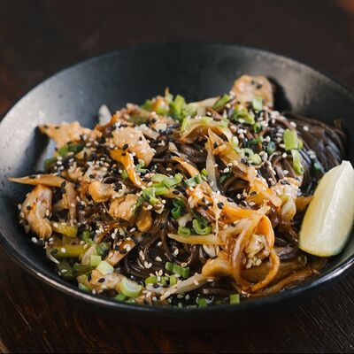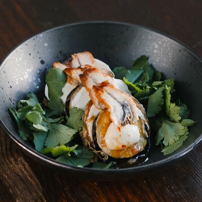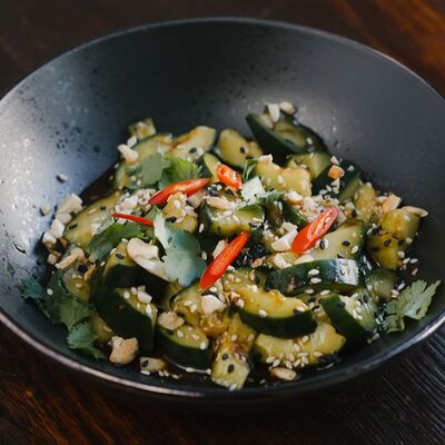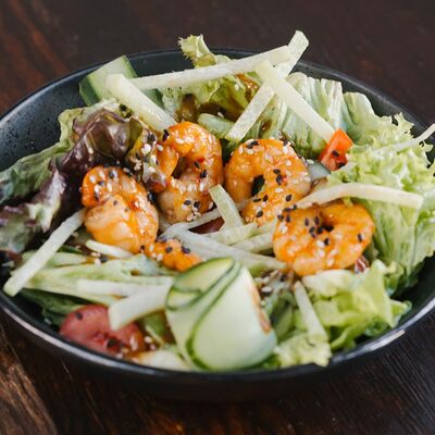 Листья салата, утка, огурцы, помидоры черри, апельсин, творожный сыр, кунжут, кешью, соус гальби