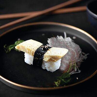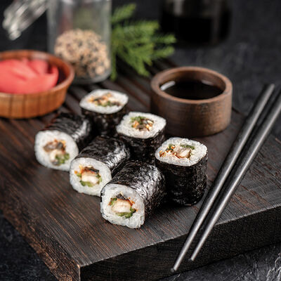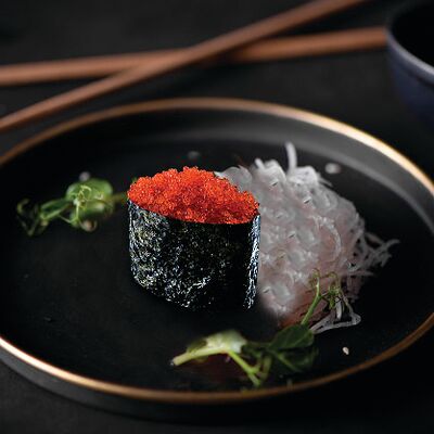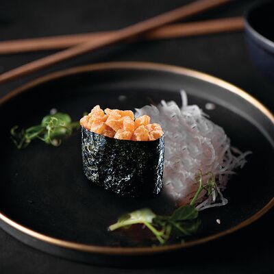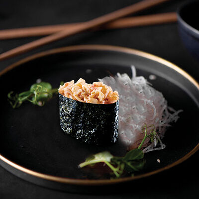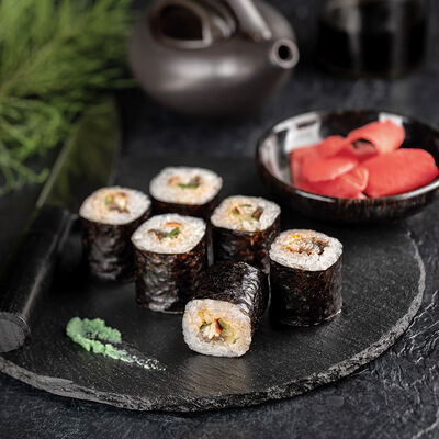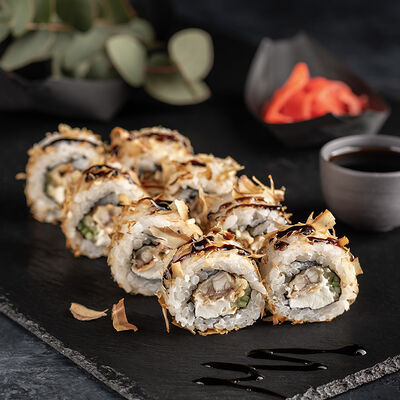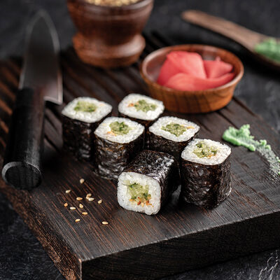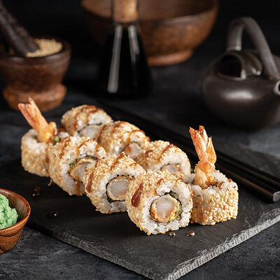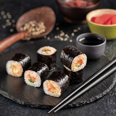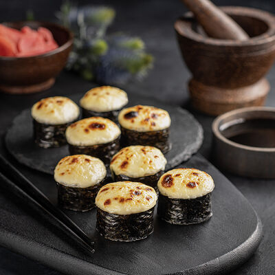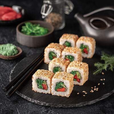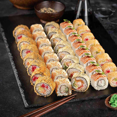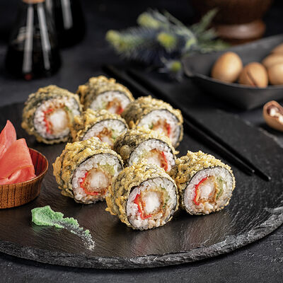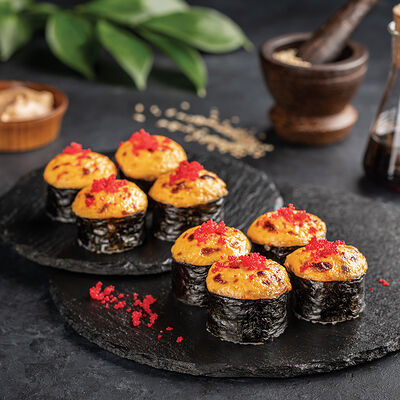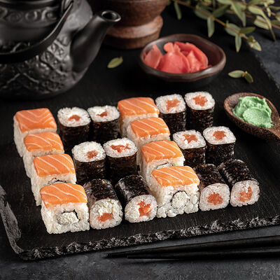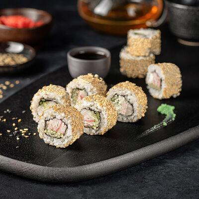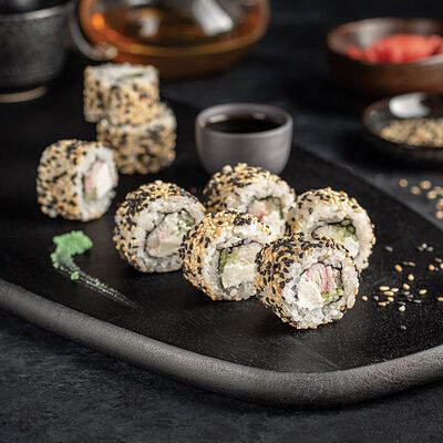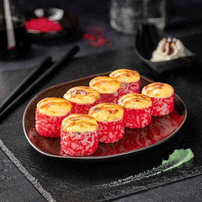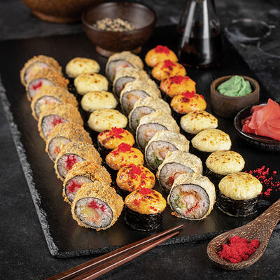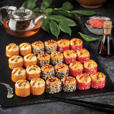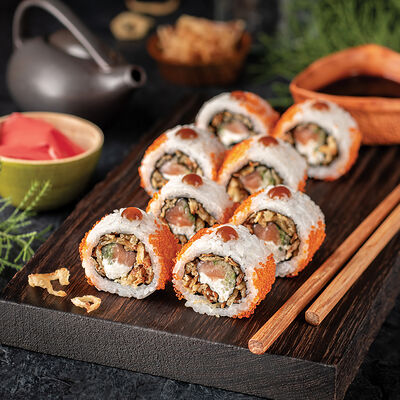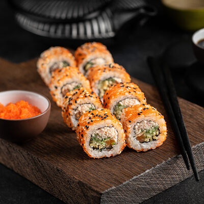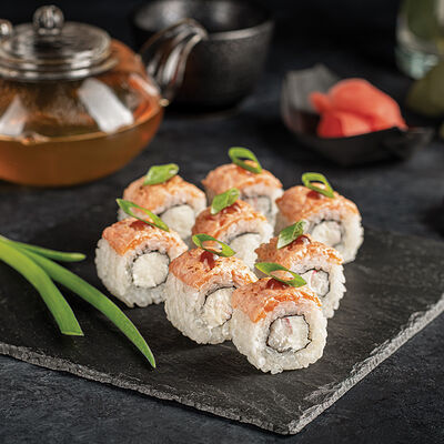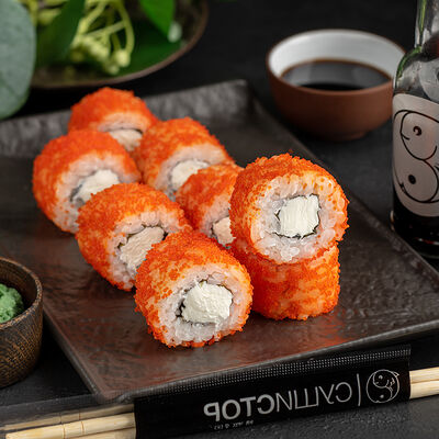 Лосось, салат айсберг, тамаго, масаго, крем соус, сыр Cremette, спайси соус. (8шт.) В состав сетов и роллов не входит соевый соус, имбирь, васаби. Комплектация приобретается отдельно!