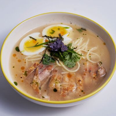Лапша яичная, яйцо, бедро куриное с кожей, укроп, кинза, нори
