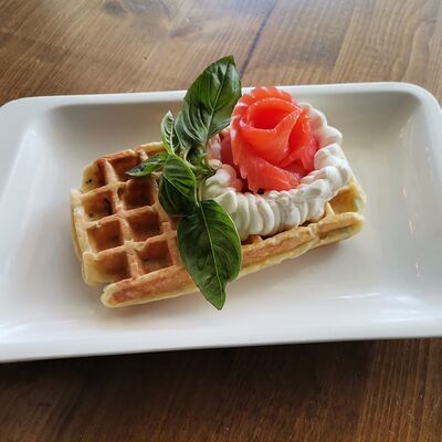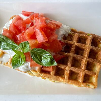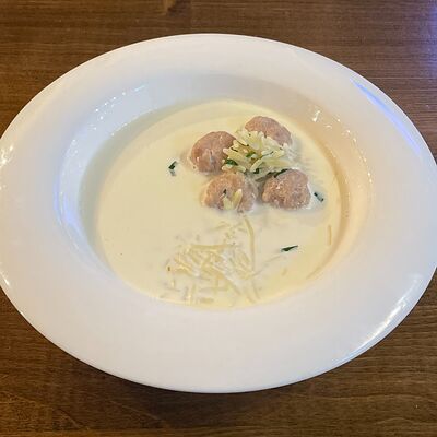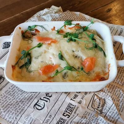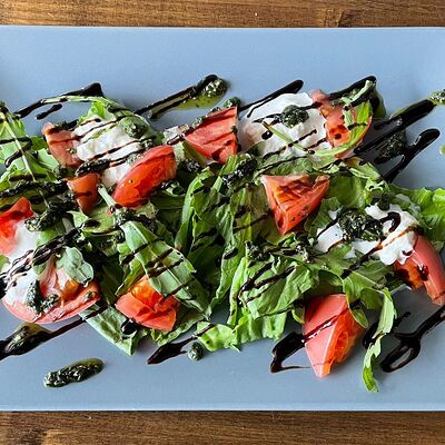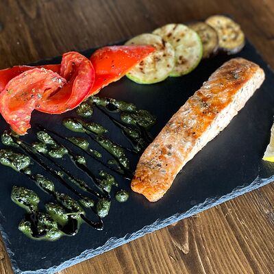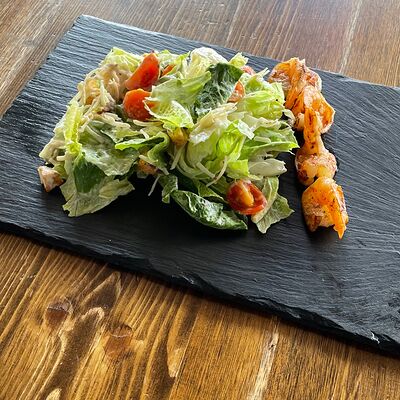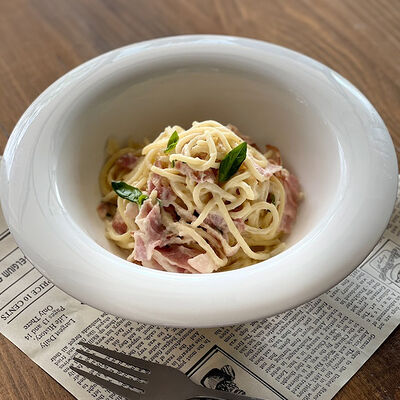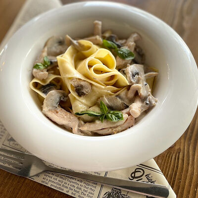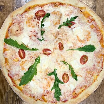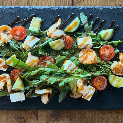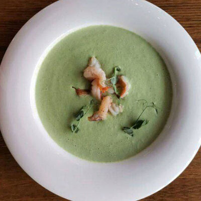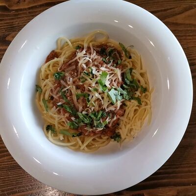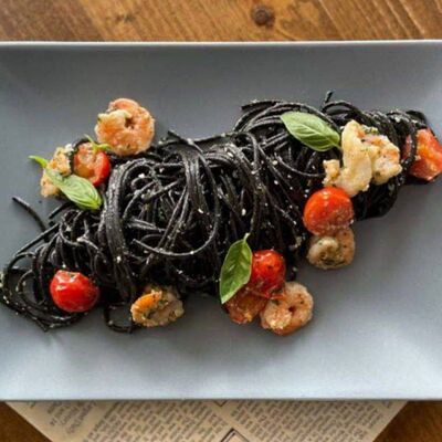 Спагетти, соус песто, креветки, сыр пармезан, зелень