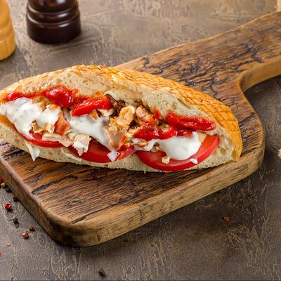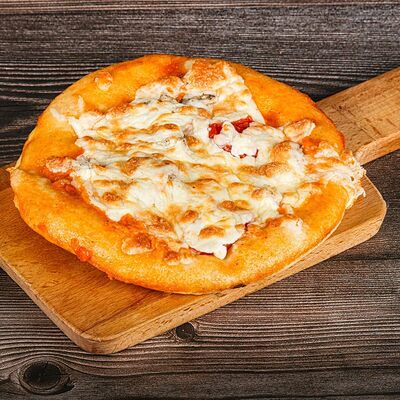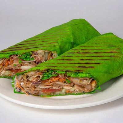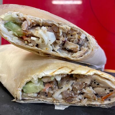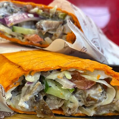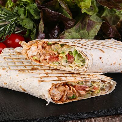 Куриное филе, огурцы, помидоры, капуста, красный лук, чесночный соус, лепешка, картофель фри