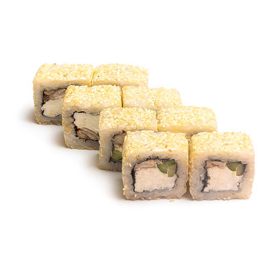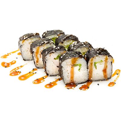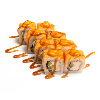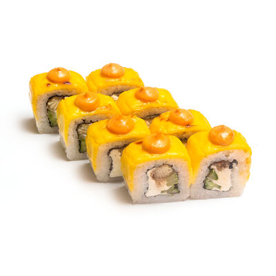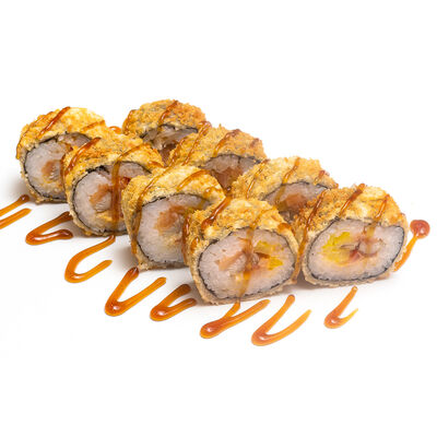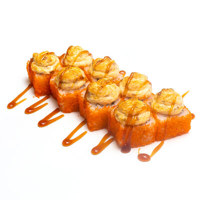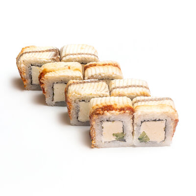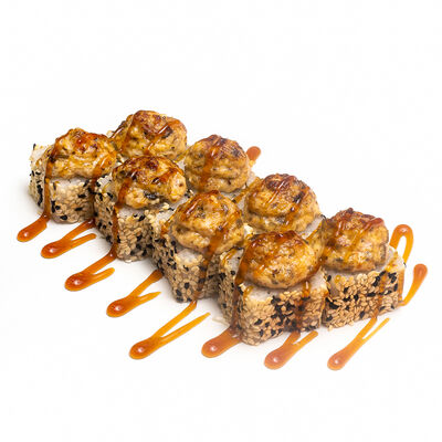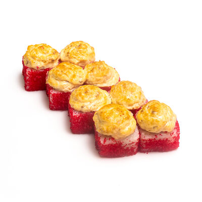 Ролл Нежный с угрем запеченный, ролл Лосось терияки запеченный, ролл Печеная креветка запеченный, ролл Вулкан бекон запеченный