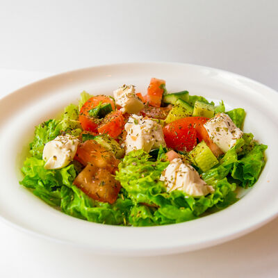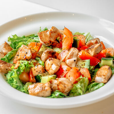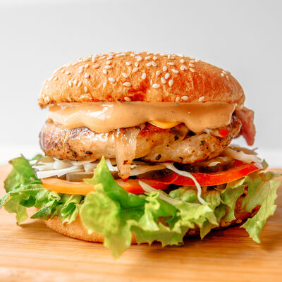 Лепешка, филе свинины, сыр голландский, соус чесночный, лист салата, помидоры жареные, халапеньо жареный, лук жареный, соус