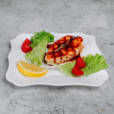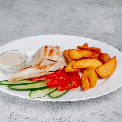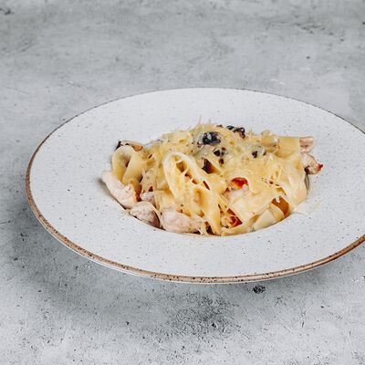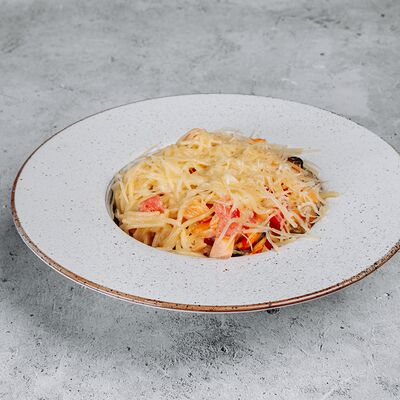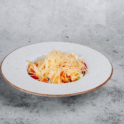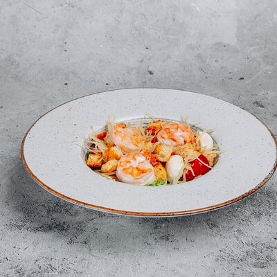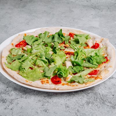 Тесто, сыр моцарелла, куриное филе, креветки, помидоры черри, соус цезарь, лист салата (30 см)