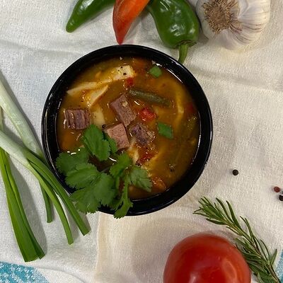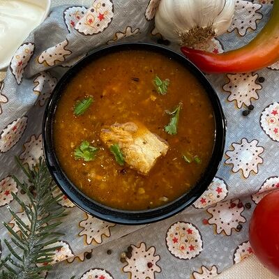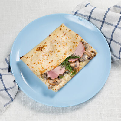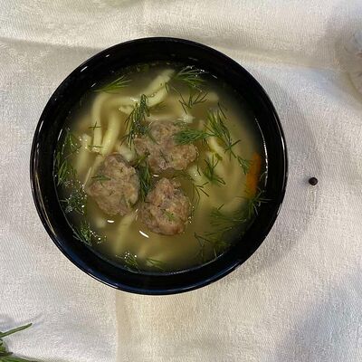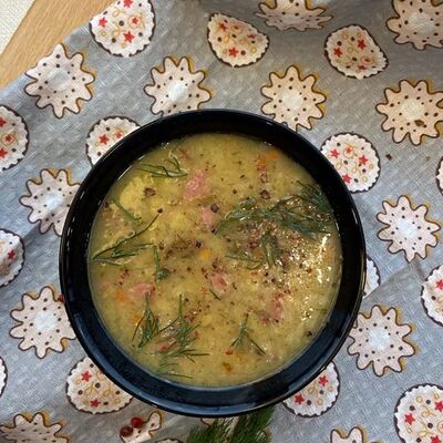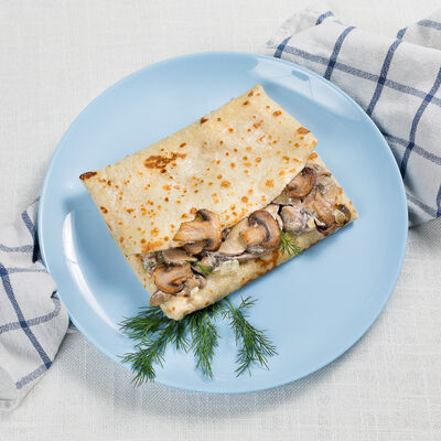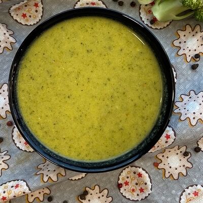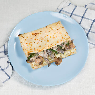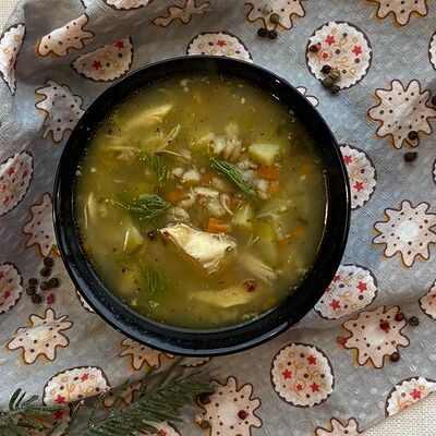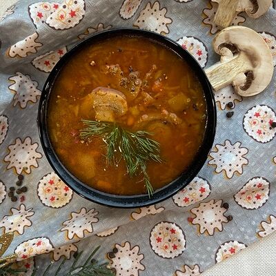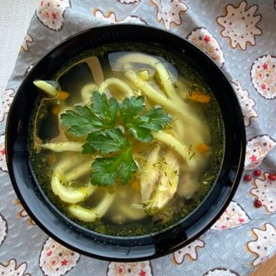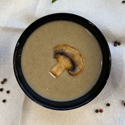 Куриный бульон, шампиньоны, лук репчатый, сливки питьевые 10%, мука пшеничная высший сорт, соль пищевая, перец черный молотый