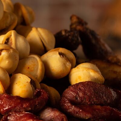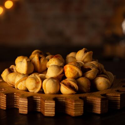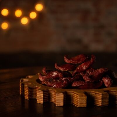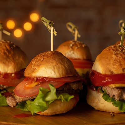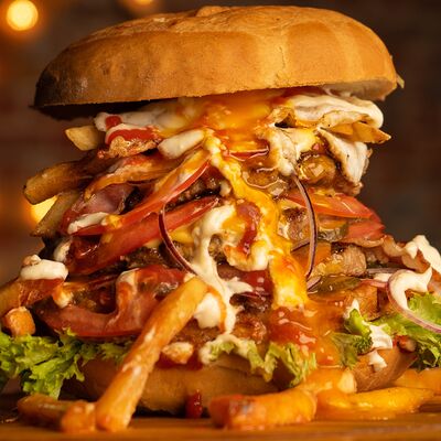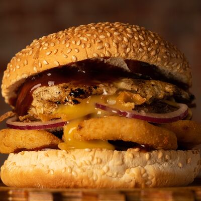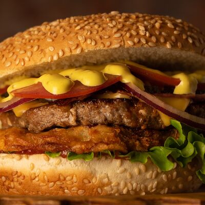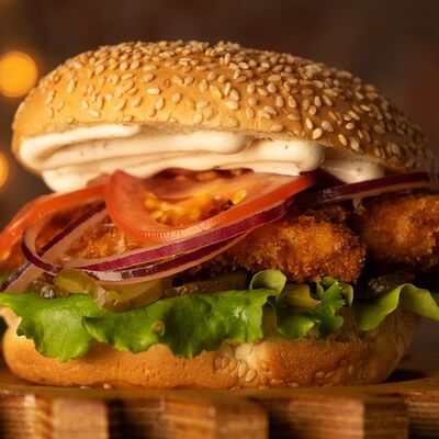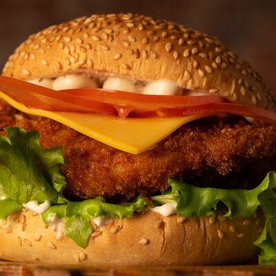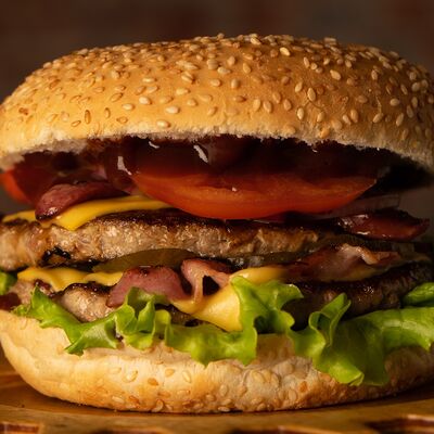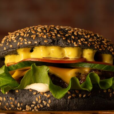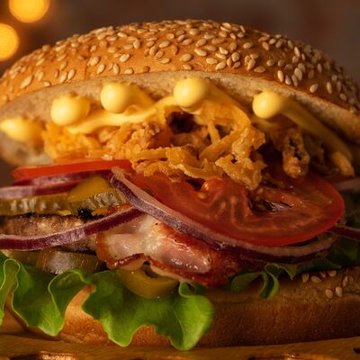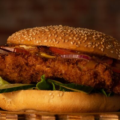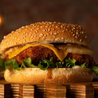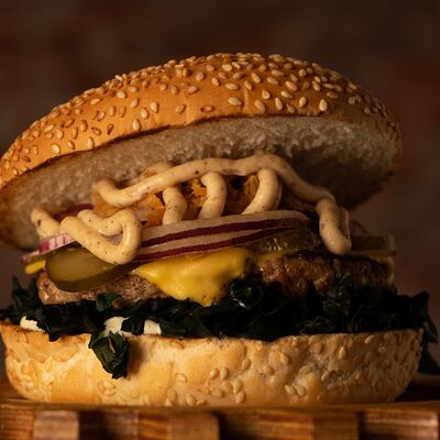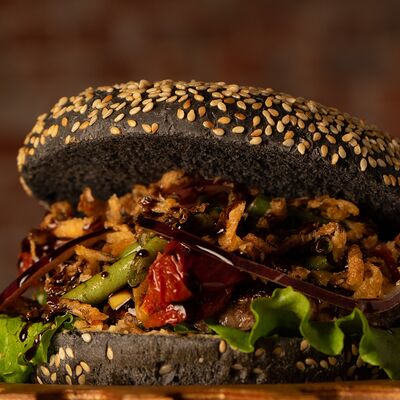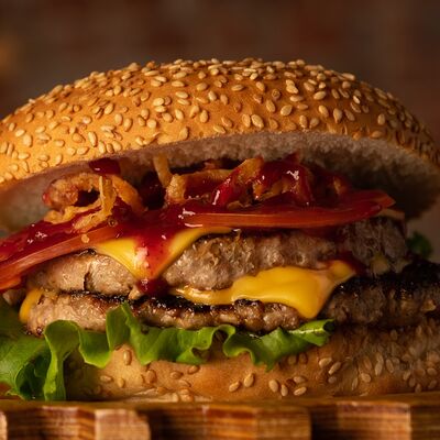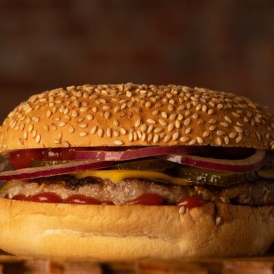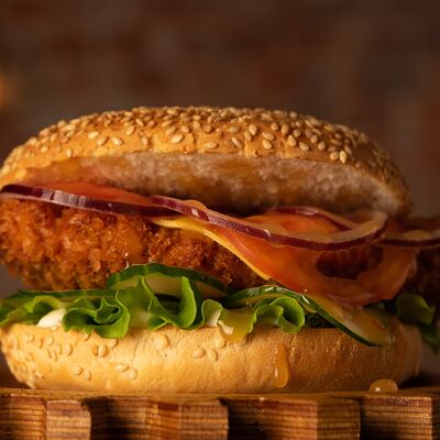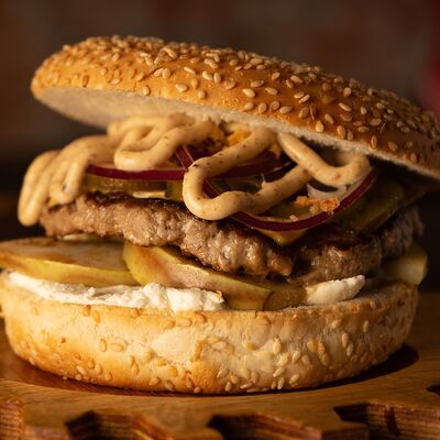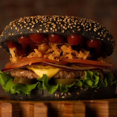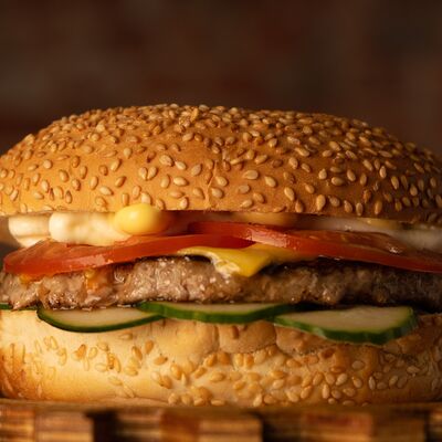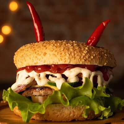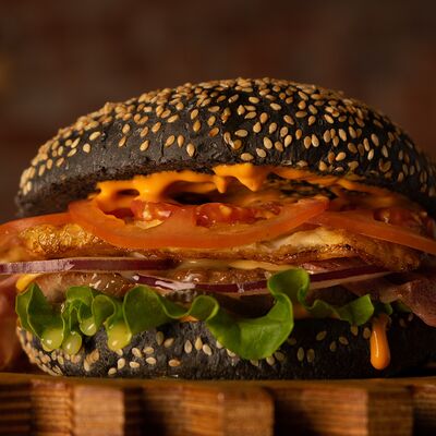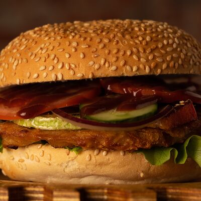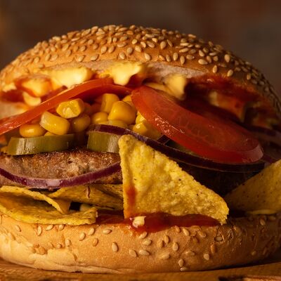 Булка белая с кунжутом, свинина, сыр чеддер, салат, помидор, огурец, лук маринованный, халапеньо, соус кетчуп, соус острый Zombie