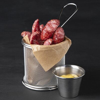 Ароматные обжаренные до корочки охотничьи колбаски. Дополнены горчичным соусом