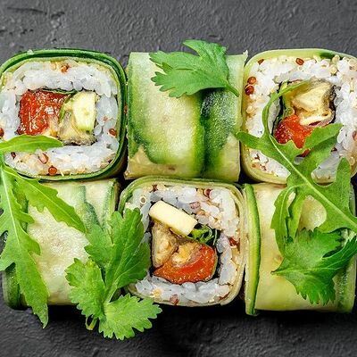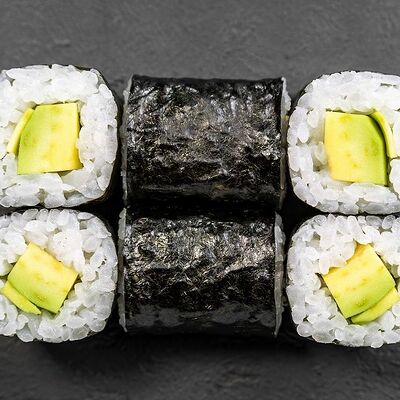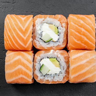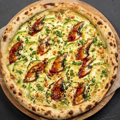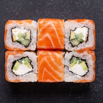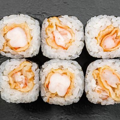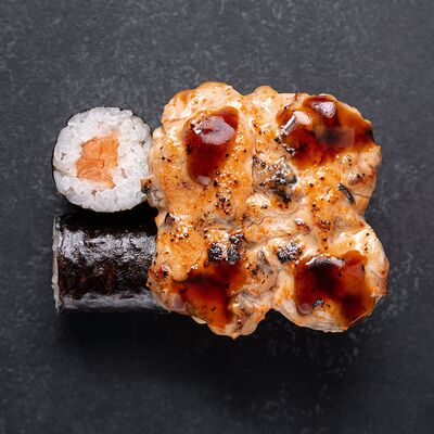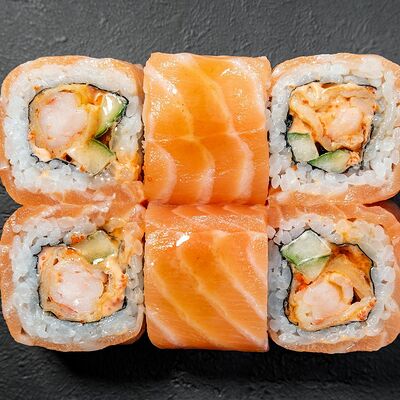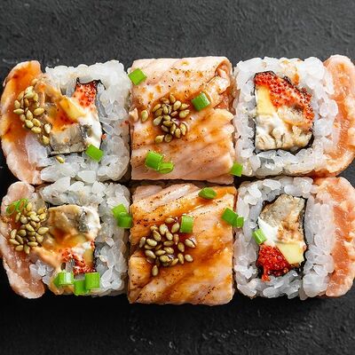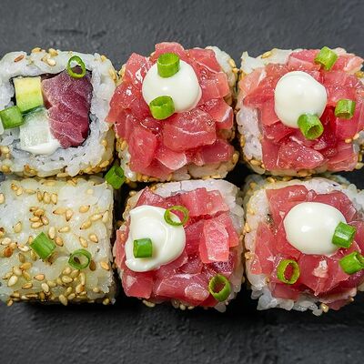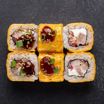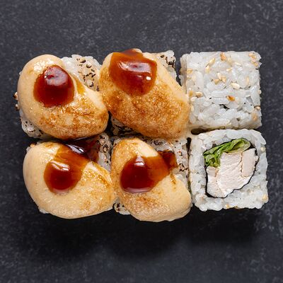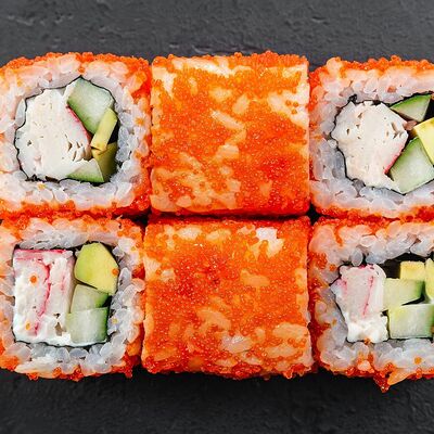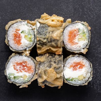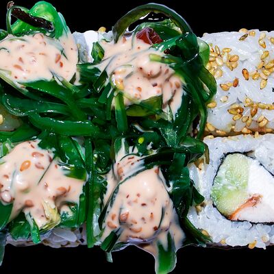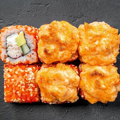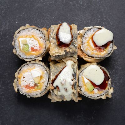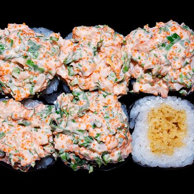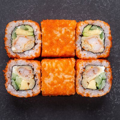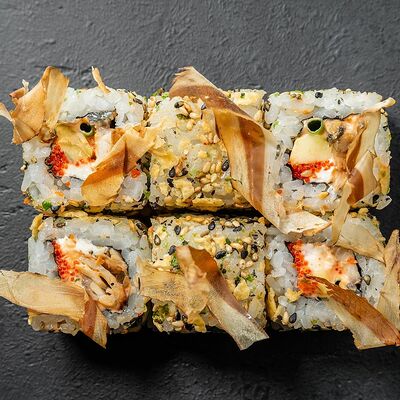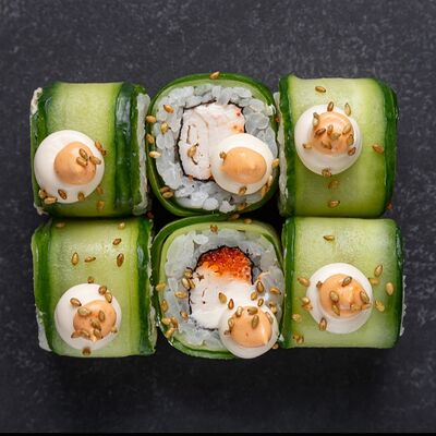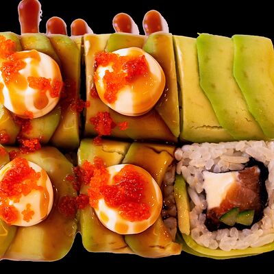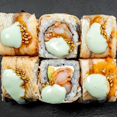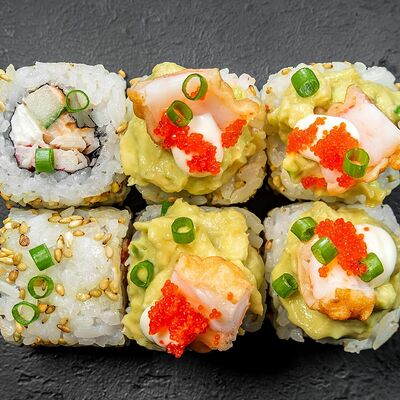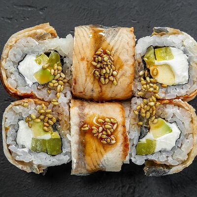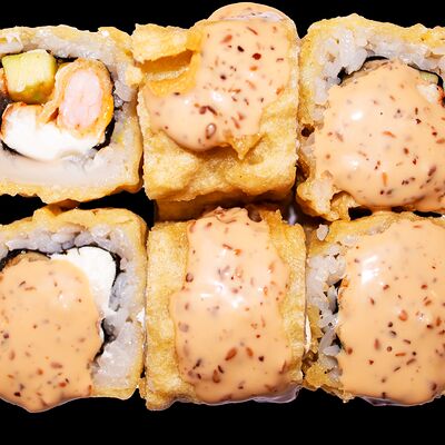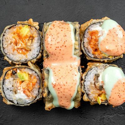 Сливочный сыр, снежный краб, огурец, пюре авокадо, креветка в темпуре, икра тобико, кунжут, соус унаги, соус спайси, соус юдзу, майонез, зеленый лук