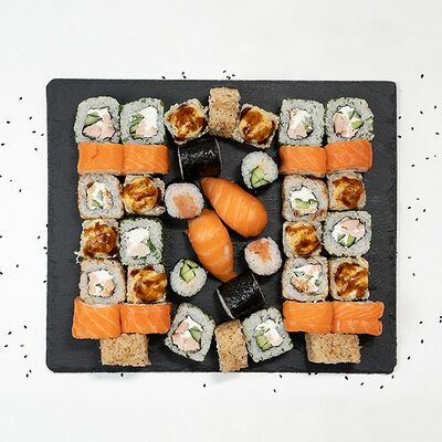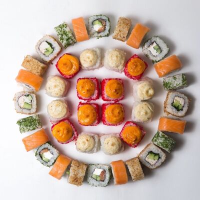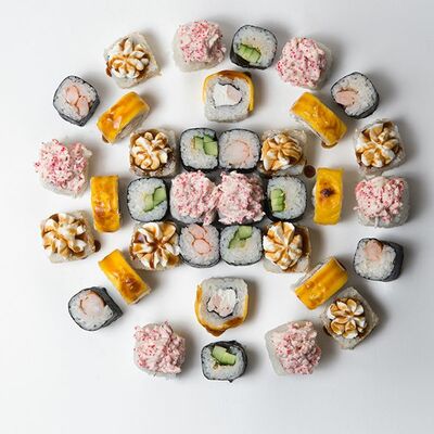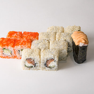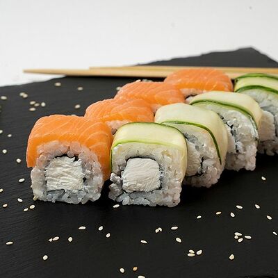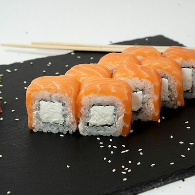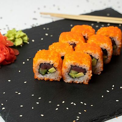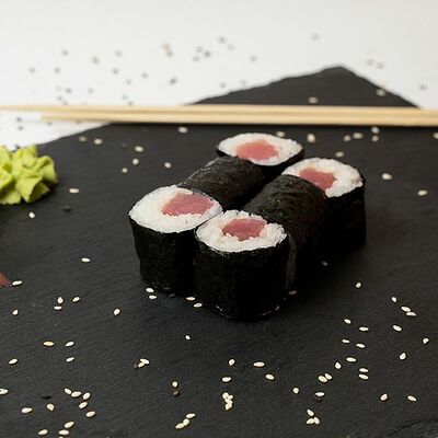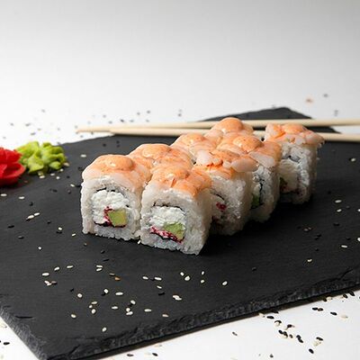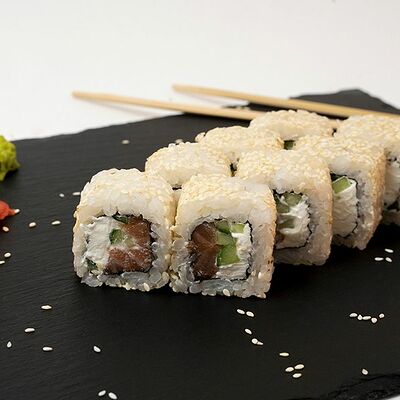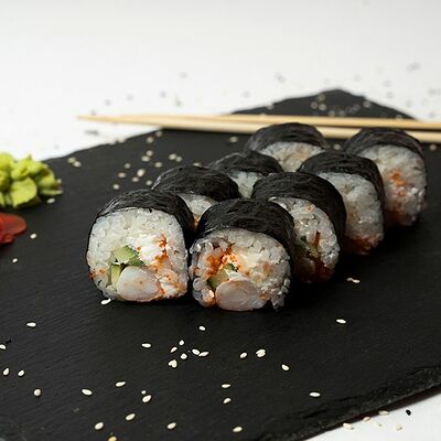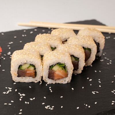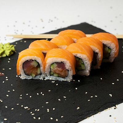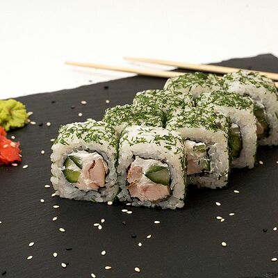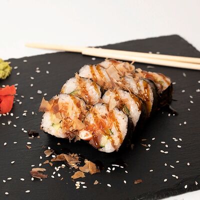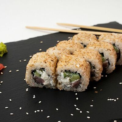 Рис, нори, тунец, сливочный сыр, огурец, стружка тунца