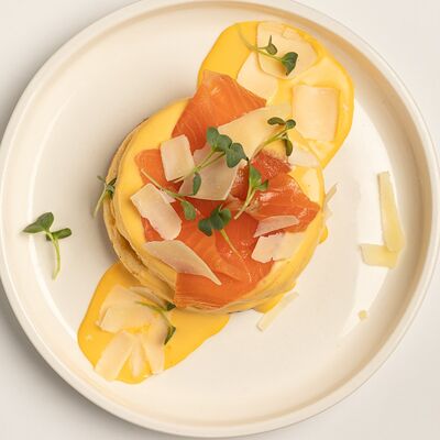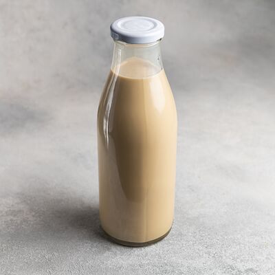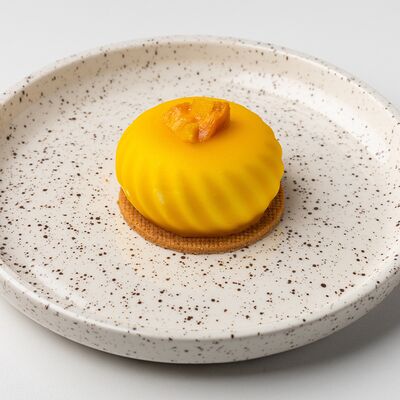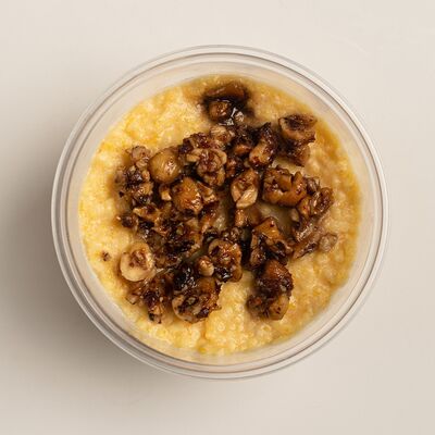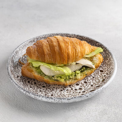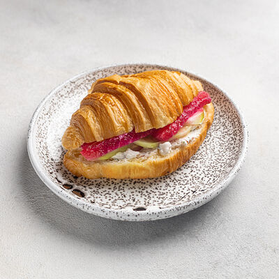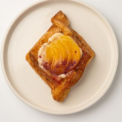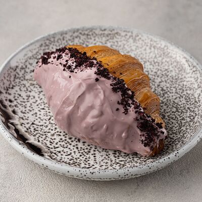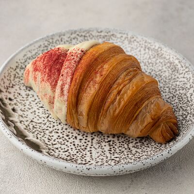 Мука, сливочное масло, дрожжи, молоко, яйцо, малиновое конфи (пюре малины, сахар, глюкоза, пектин) и ванильный заварной крем (молоко, паста ванильная, сахар, желток, масло сливочное, крахмал). Оформляется глазурью из белого шоколада и сублимированной малиной