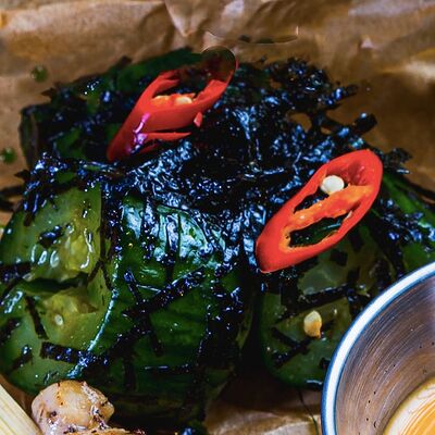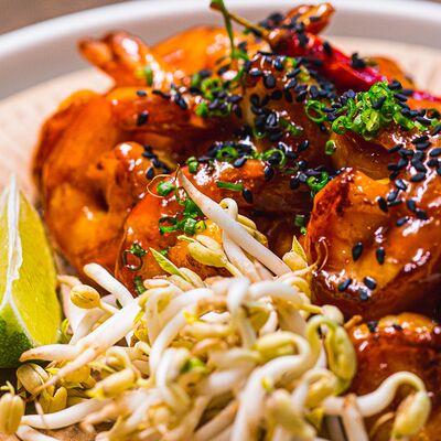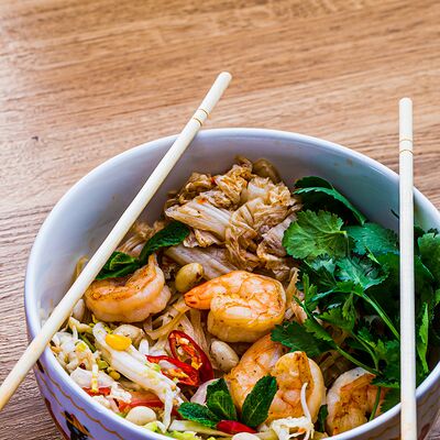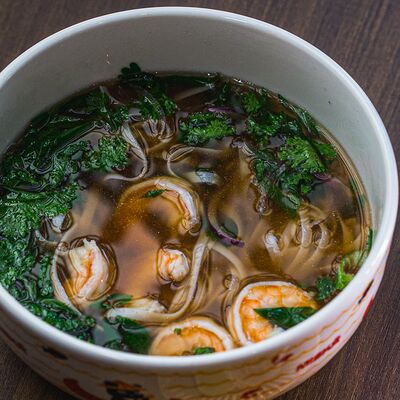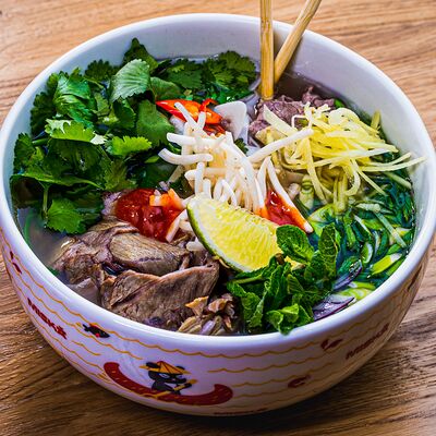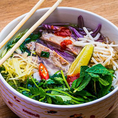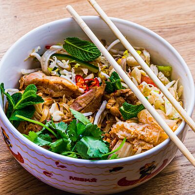 Томленая остро-пряная лапша с куриным бедром и овощами (лук красный, лук зеленый, имбирь, перец чили)