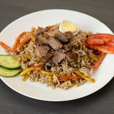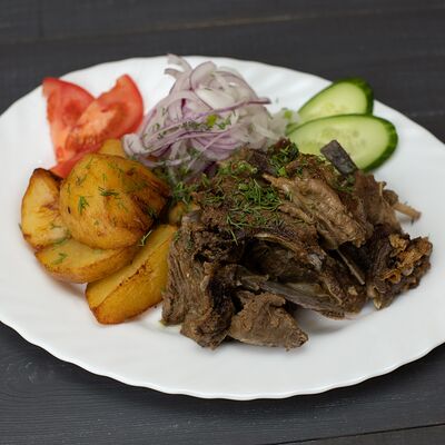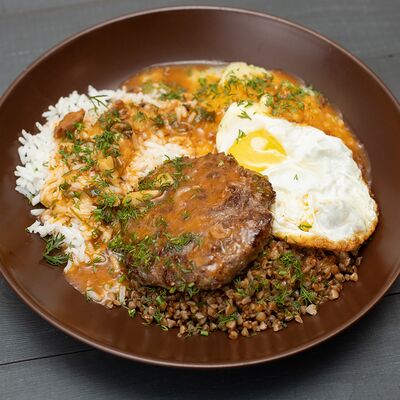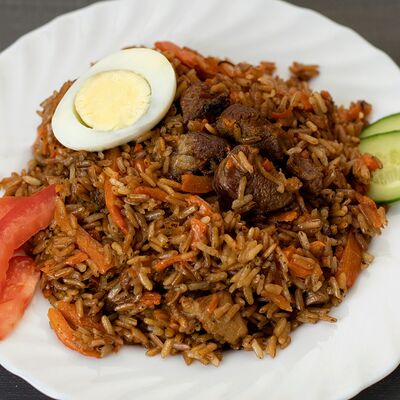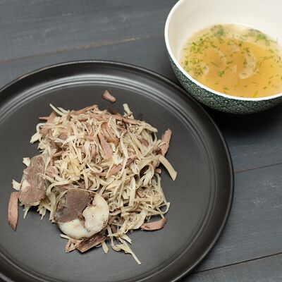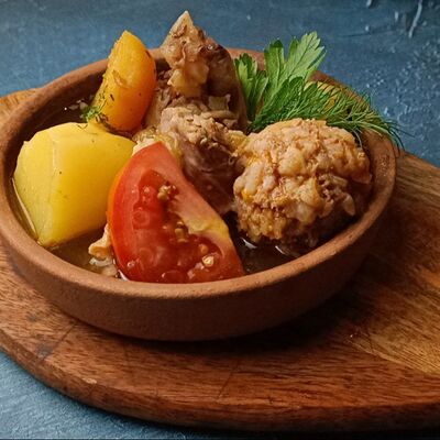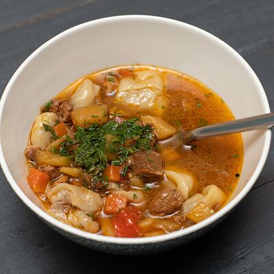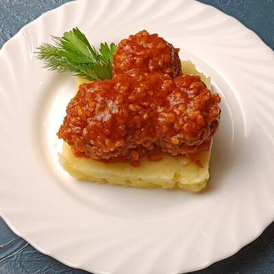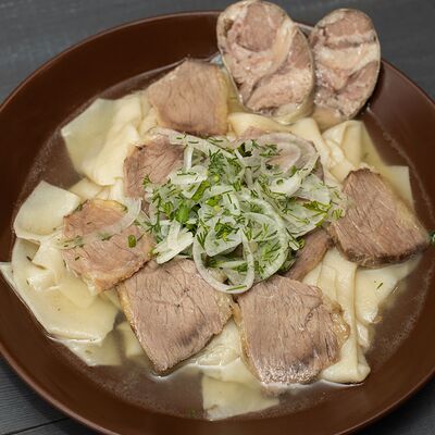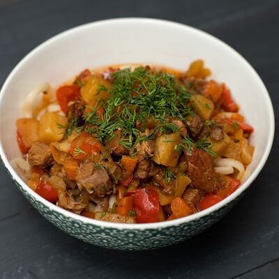 Тефтели из говяжьего фарша в томатном соусе, лапша домашняя ручной лепки, специи