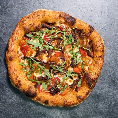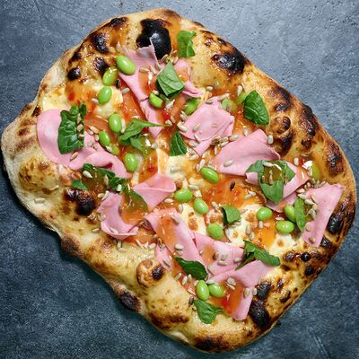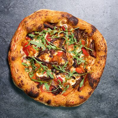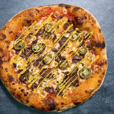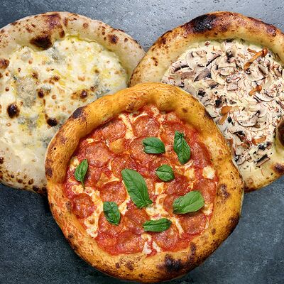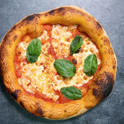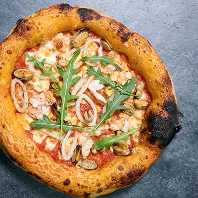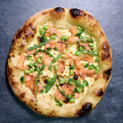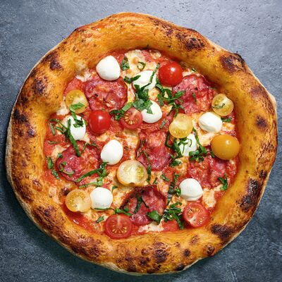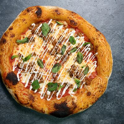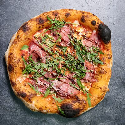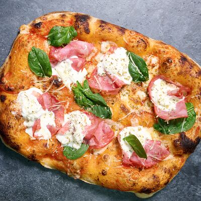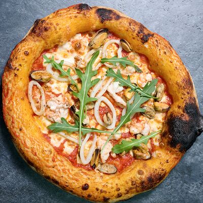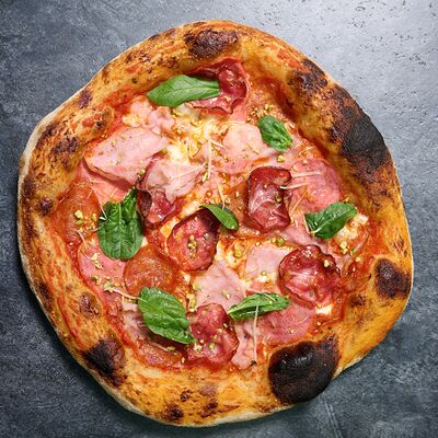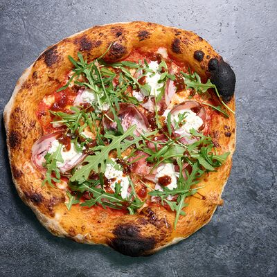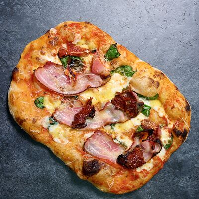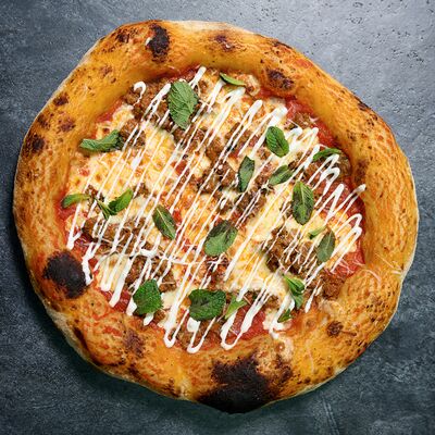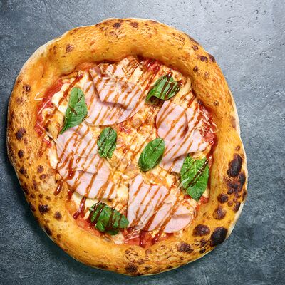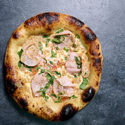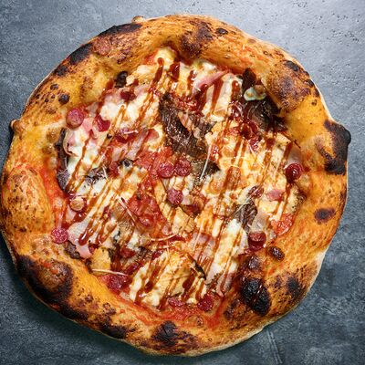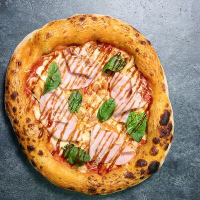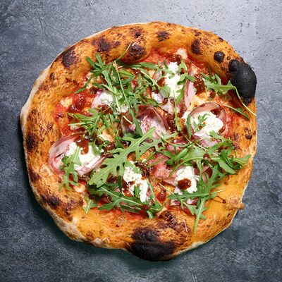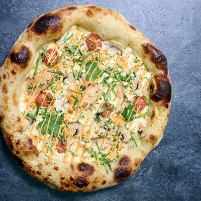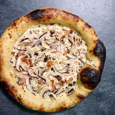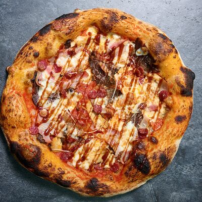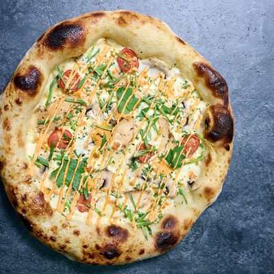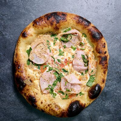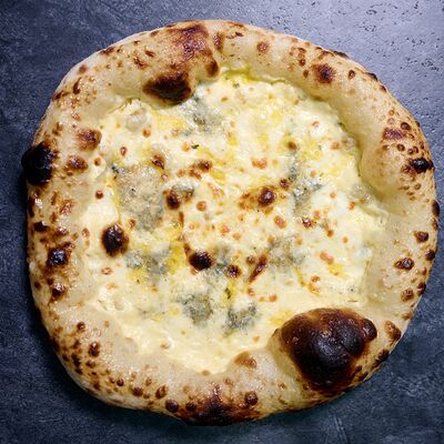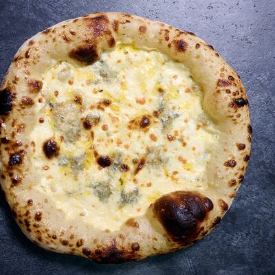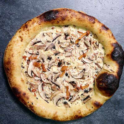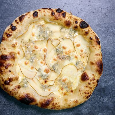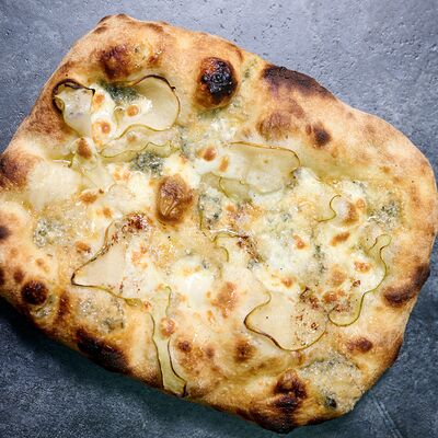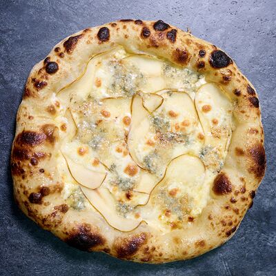 Неаполитанское тесто, белый соус (сыр творожный и сливки), сыр горгондзола, груша, грецкий орех, мёд, масло пряное, сыр пармезан, орегано (25 см)